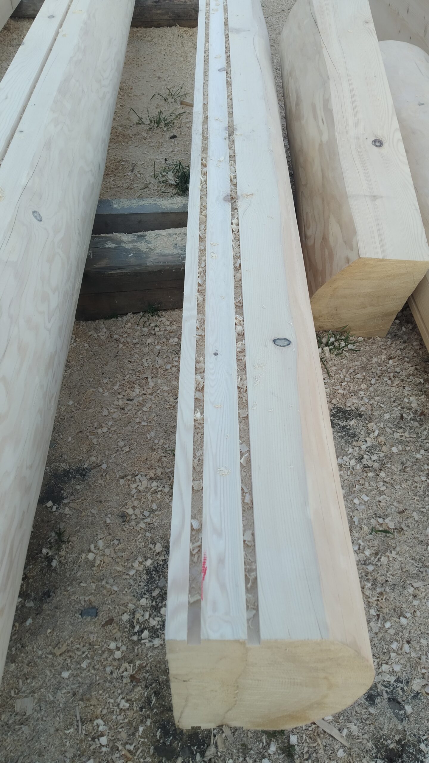 Od strony półokrągłej będzie przyklejona taśma rozprężna 3cm, w pierwszym wyfrezowanym rowku będzie się mieściło pierwsze obce pióro. Między dwoma frezowaniami jest wyżłobione lekkie zagłębienie na 4 cm-wy pasek wełny konopnej tak aby po położeniu bal na bal był idealny styk. W drugie frezowanie też pójdzie obce pióro. O to mój sposób na uszczelnienie łączenia płazów. Wszystkie te elementy będą montowane już przy składaniu domu u nas na działce. Na na razie więc składamy dom bez elementów wypełniających.