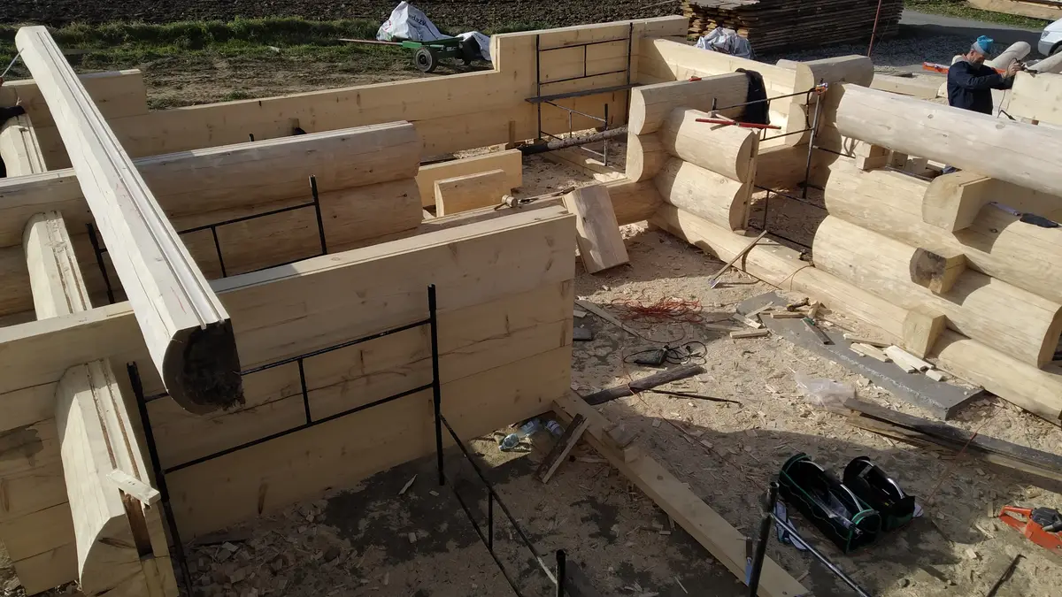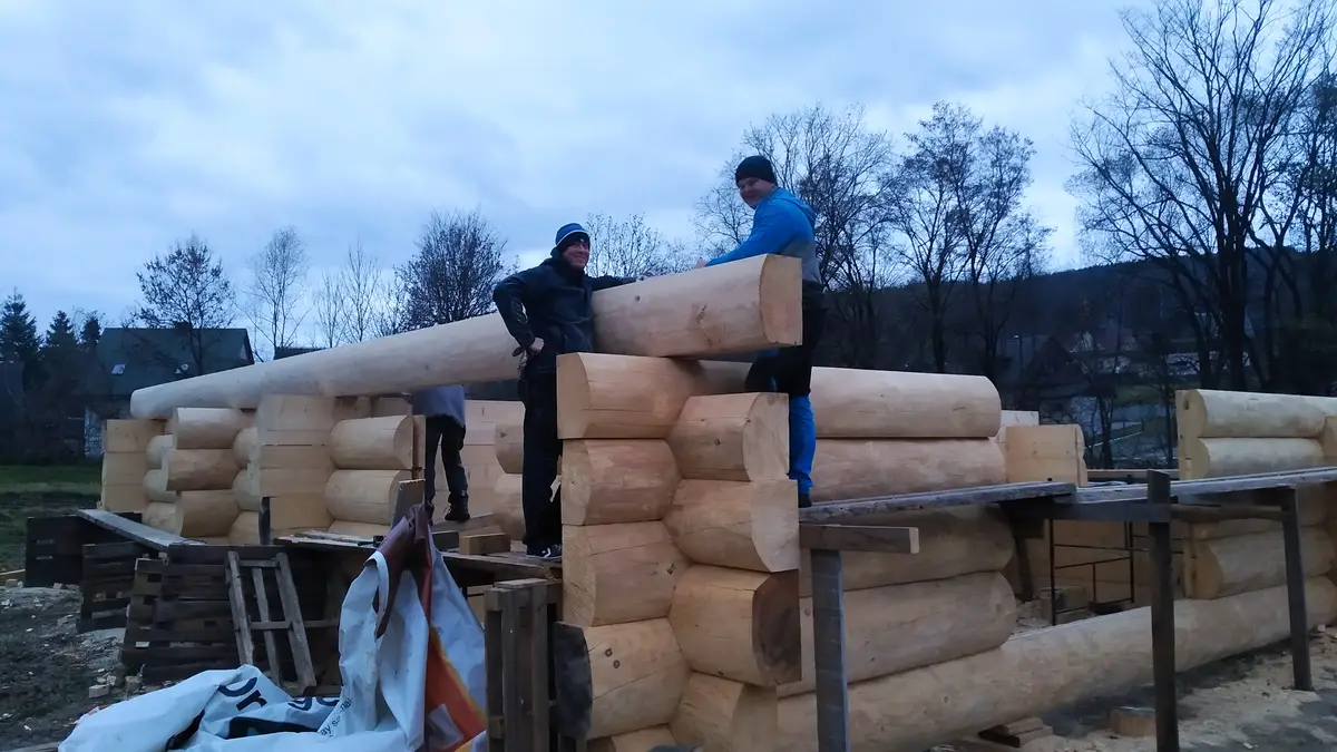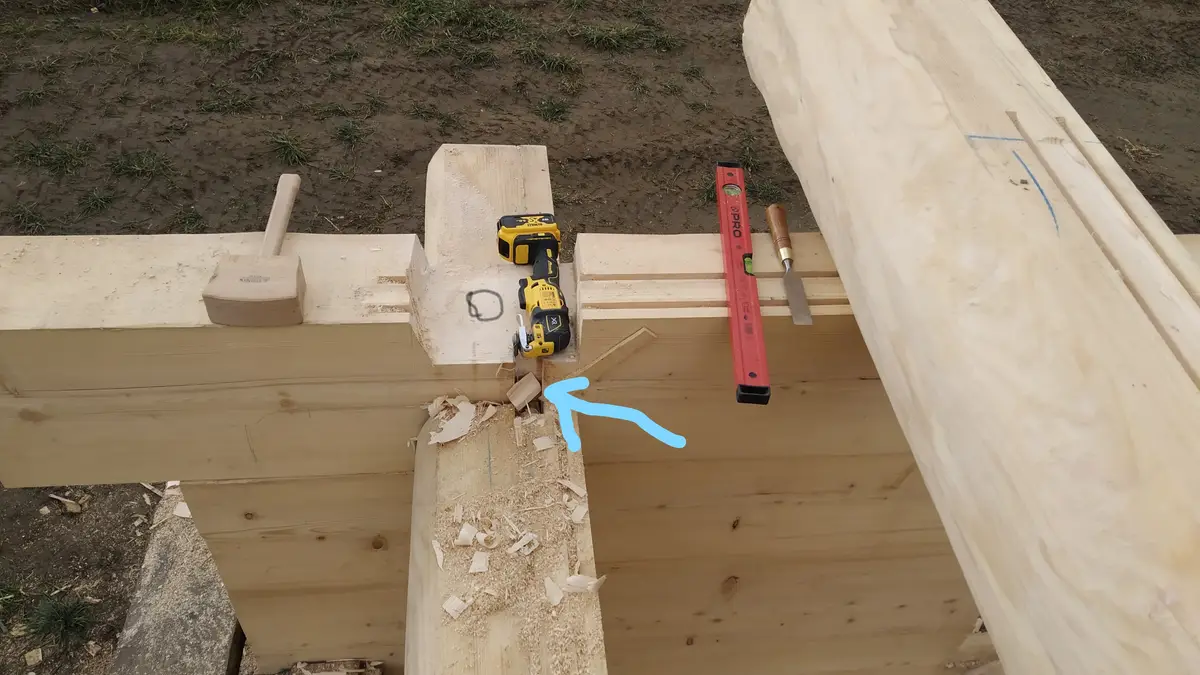 We wcześniejszych wpisach wspominałem, że postanowiliśmy robić zwykłe proste węgły. Dołożyliśmy do tego jeszcze miejsce na kantówkę 5x5cm (miejsce zaznaczone strzałką). Wbita kantówka „na ciasno” doda jeszcze lepszego trzymania węgłów. Do tego w miejscu zaznaczenia tym szarym nieudolnym kółkiem 🙂 będzie wywiercone miejsce na bukowy toczony kołek i wchodzić będzie do węgła przychodzącego z góry. Dzięki tym zabiegom całość będzie dobrze trzymała, dom będzie sobie spokojnie siadał i pracował a węgły nie będą się zawieszały. Stara metoda dziadka Piotrka zastosowana w XXI wieku :). Na zdjęciu mój ulubiony zestaw do robienia węgłów: