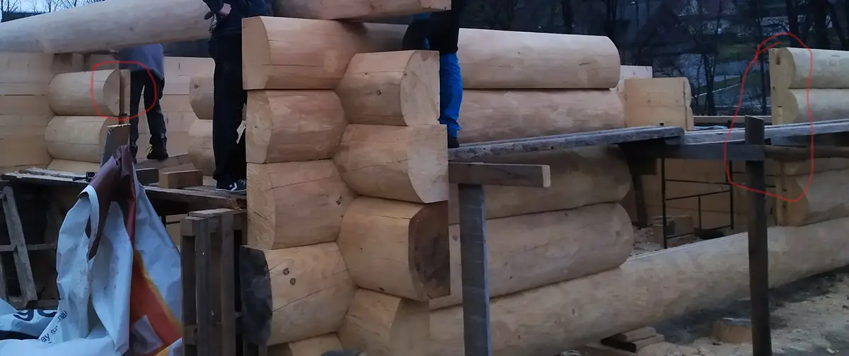 W miejscu montażu okien zostawiamy otwory. Na bokach tych otworów – czyli to co w zaznaczonym kółku robimy wcięcia na kantówki 5x5cm. Daje to stabilność na zakończeniu bali oraz kantówka ta pozwala na montaż drewnianej ramy okiennej, w której będzie zamontowane okno. Okno będzie na stałe zamontowane w ramie a rama przytwierdzona do kantówki, która będzie niezależnie pracowała gdy dom będzie osiadał. Znane są historie, że okna potrafią pękać lub nie otwierać się przy niewłaściwym montażu. Aby tego uniknąć należy coś takiego zastosować.