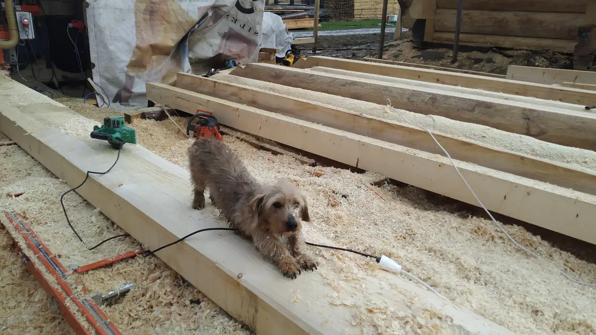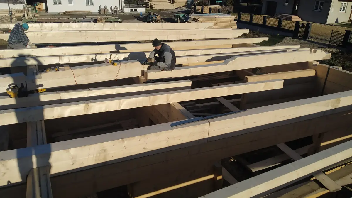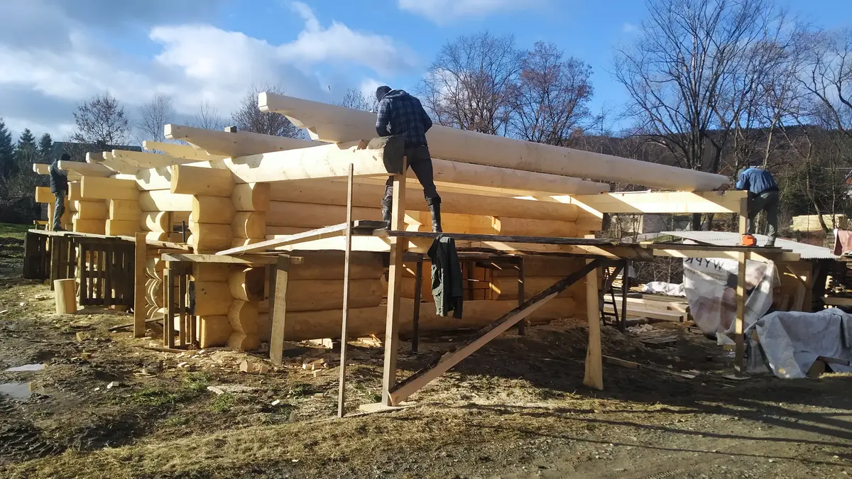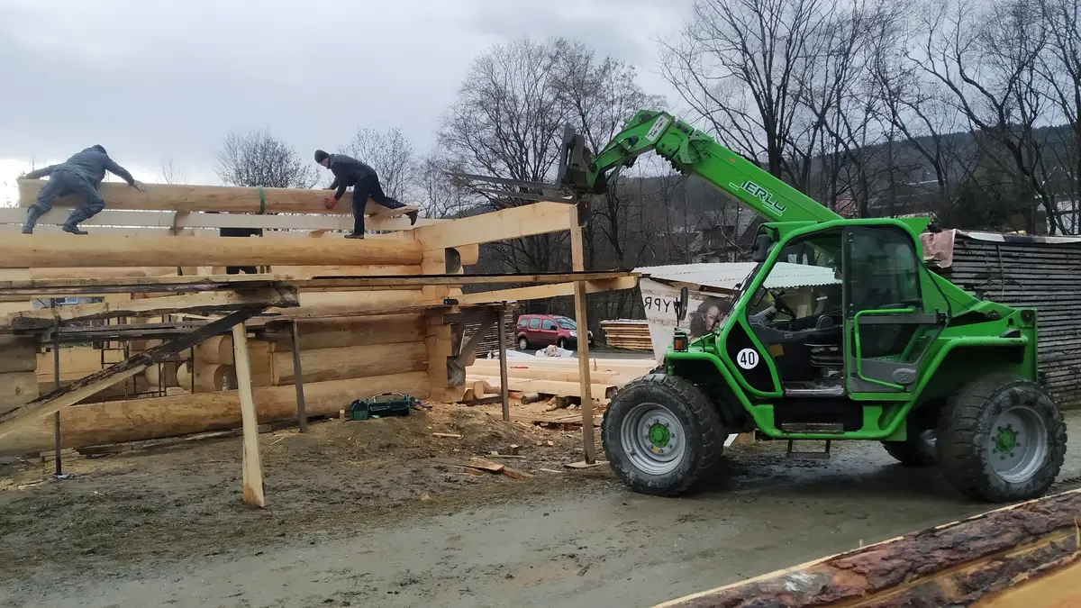 Stworzył się kolejny problem, ponieważ na budowie było już dosyć wysoko i wózek widłowy nie dosięgał aby podawać bale na górę. Ręcznie też nie bardzo, ponieważ płazy ważyły nawet kilkaset kg. Z pomocą przyszedł zaprzyjaźniony warsztat drzewny z okolicy i użyczył mi ładowarki teleskopowej. Piękna sprawa przy takiej budowie. Z tego miejsca wielkie dzięki Panu Stanisławowi – teściowi mojego brata za ratunek. Kolejna osoba z czynnym udziałem przy budowie. Park maszynowy w tym momencie Piotrek jeszcze miał ograniczony. Sami wiecie jaki był spontan przy naszym domu więc trzeba było improwizować. Piotrek miał zamiar po zakończeniu mojego domu uzbroić się po zęby w maszyny ale póki co trzeba było działać tym co jest.