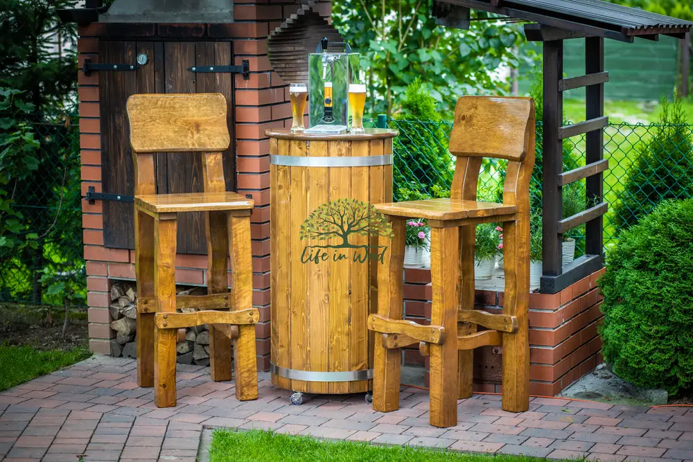 Krzesła barowe z litego drewna w kolorze brunat ustawione obok rollbaru w kształcie beczki