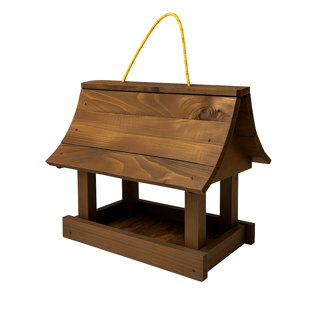 Naturalne drewno nadaje karmnikowi ciepły, tradycyjny charakter, a rustykalny styl pięknie komponuje się z zielenią ogrodu. Dwuspadowy dach skutecznie chroni karmę przed deszczem i śniegiem, zapewniając ptakom bezpieczne schronienie w chłodniejsze dni.