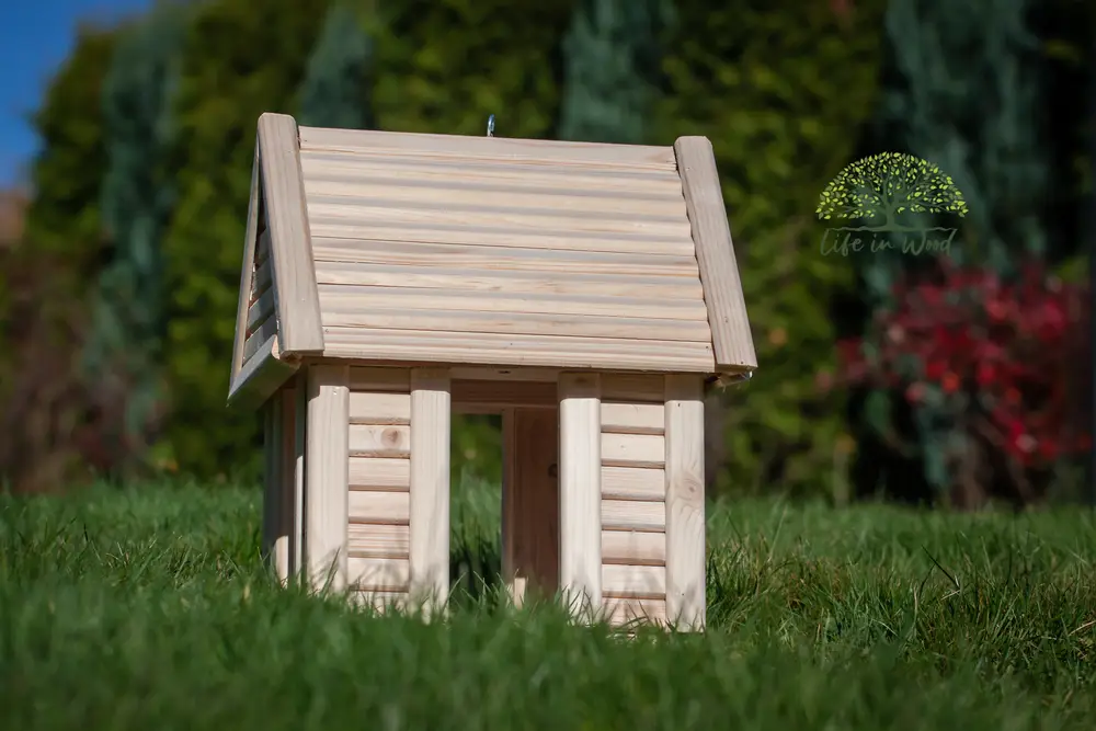 Szerokie wejście do domku przy podstawie umożliwia swobodny dostęp do pożywienia, a dwuspadowy daszek chroni przed czynnikami atmosferycznymi takimi jak deszcz, śnieg czy wiatr.