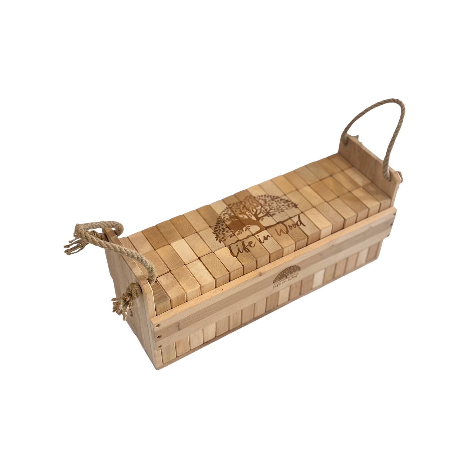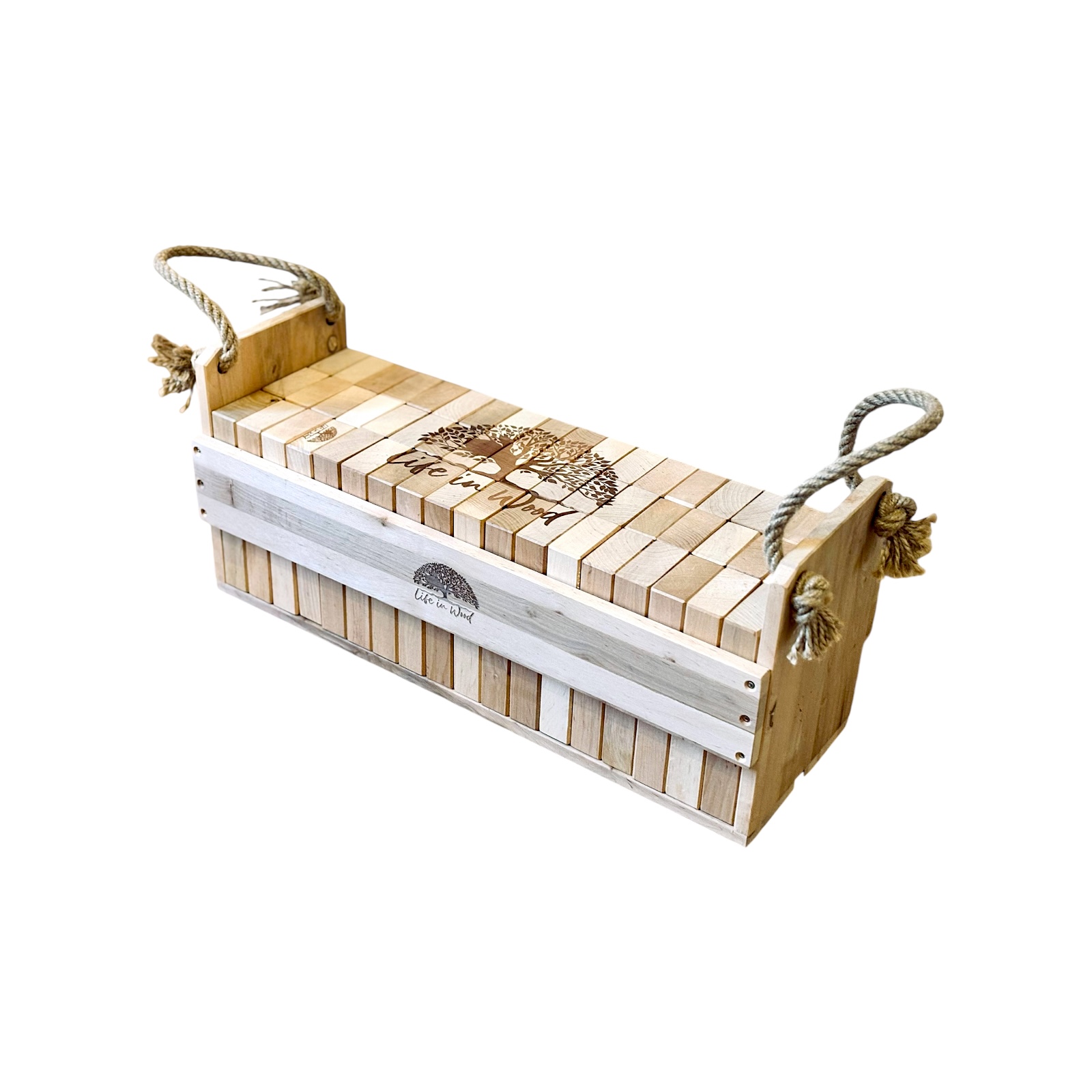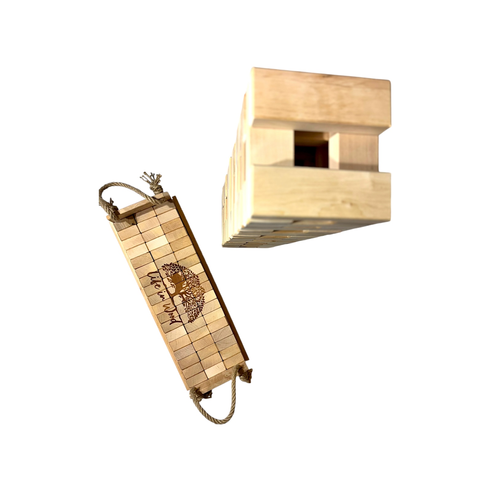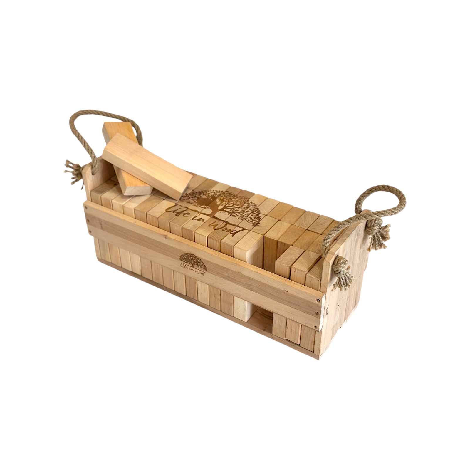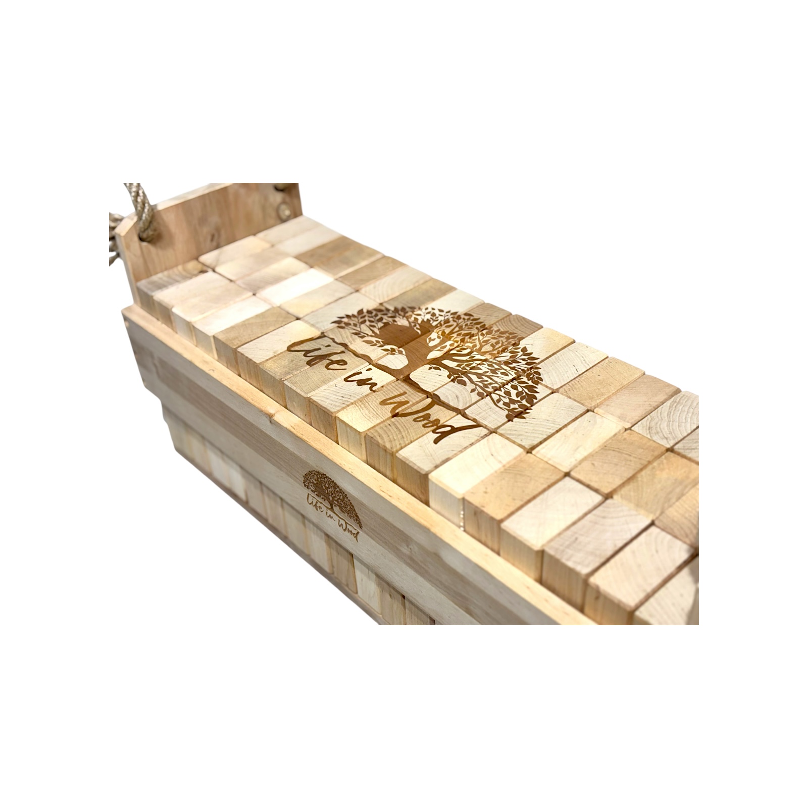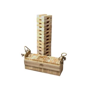 Klocki drewniane XXL z indywidualnym grawerem to połączenie zabawy, elegancji i personalizacji. Zestaw 54 naturalnych klocków z drewna olchowego w solidnej skrzyni ze sznurem jutowym zyskuje unikalny charakter dzięki możliwości naniesienia dowolnego napisu, logo czy grafiki.