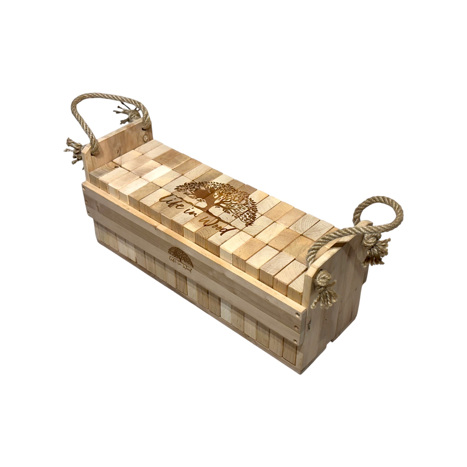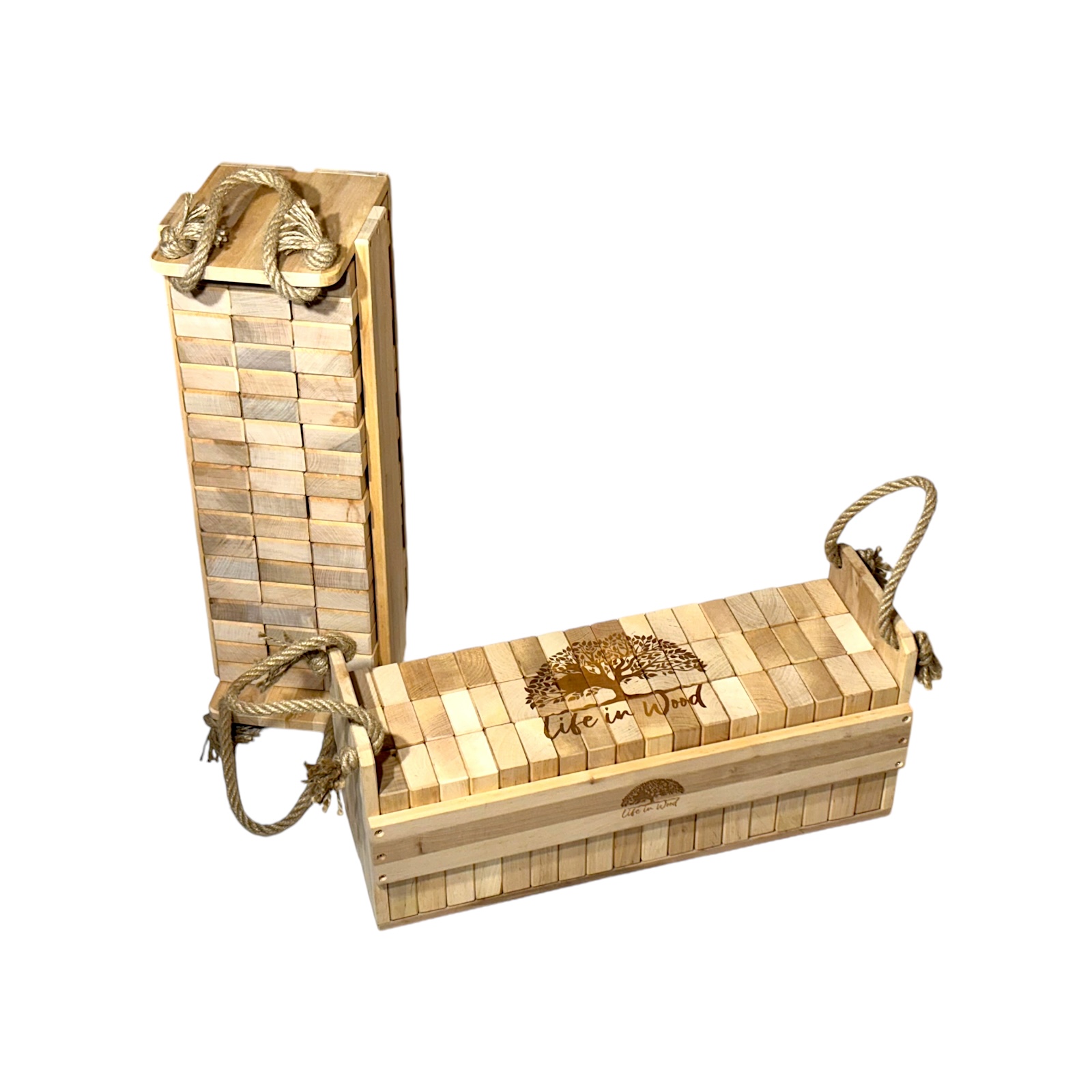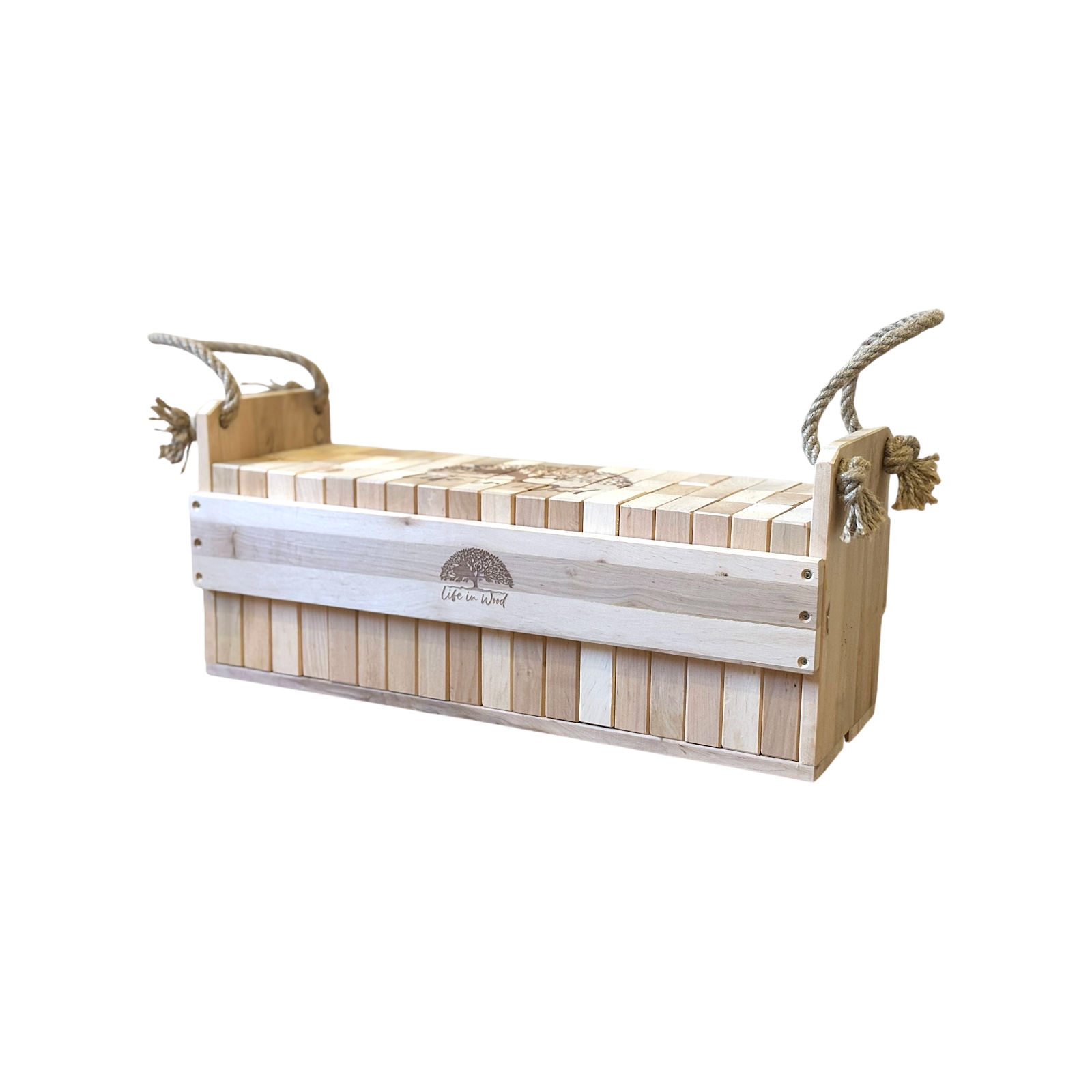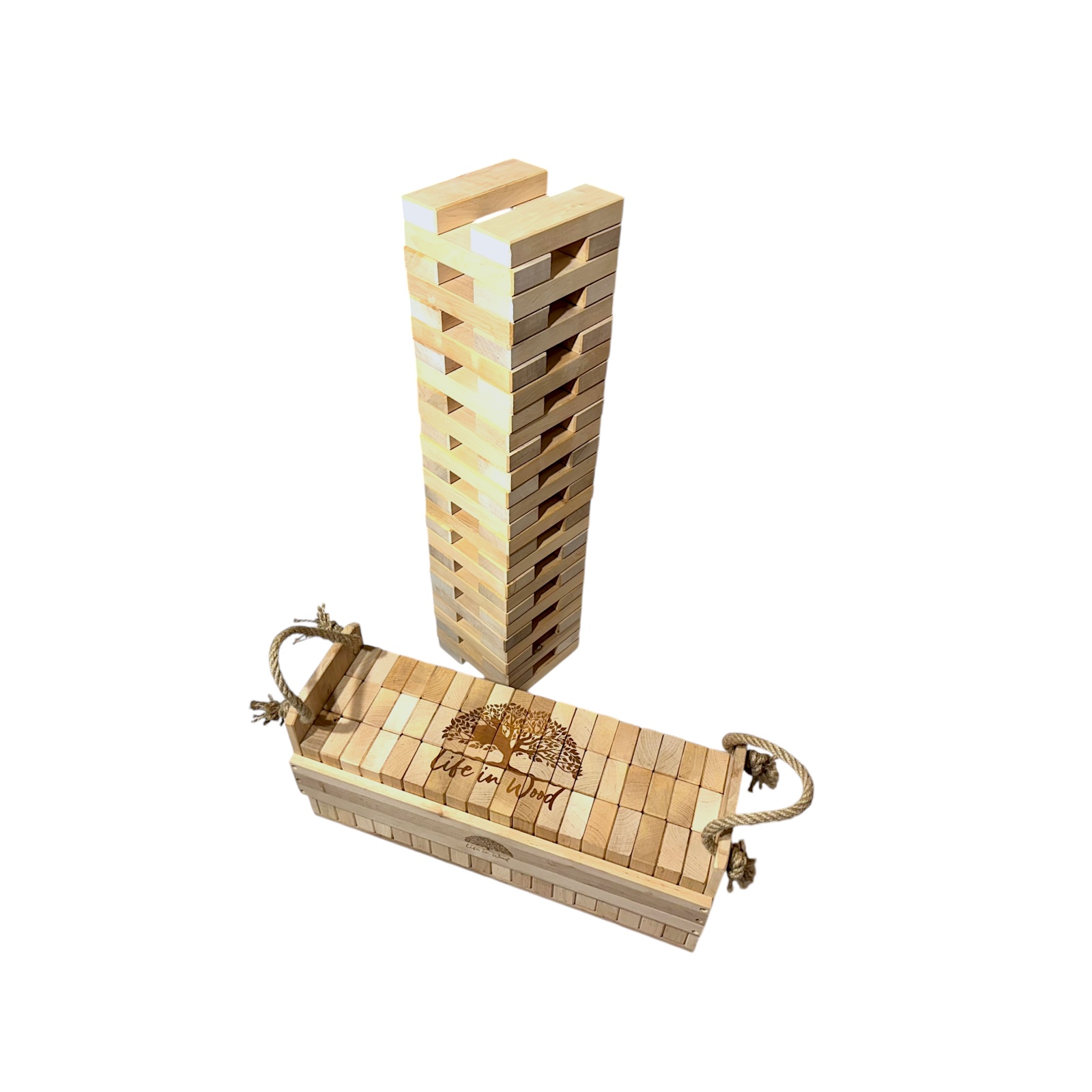 Klocki drewniane XXL z indywidualnym grawerem to połączenie zabawy, elegancji i personalizacji. Zestaw 54 naturalnych klocków z drewna olchowego w solidnej skrzyni ze sznurem jutowym zyskuje unikalny charakter dzięki możliwości naniesienia dowolnego napisu, logo czy grafiki.
