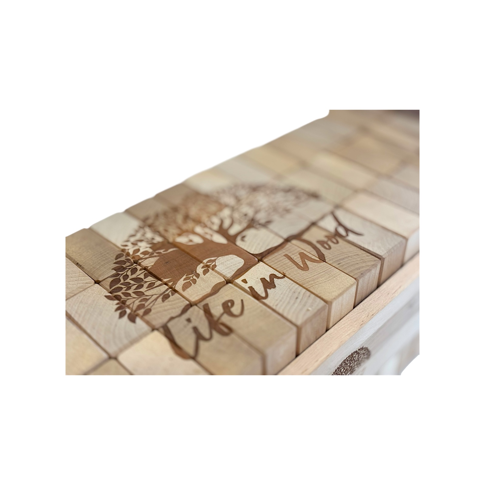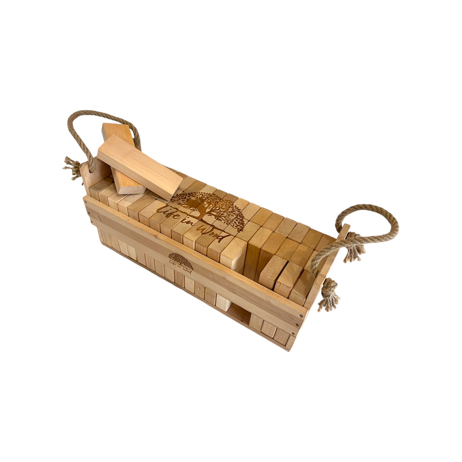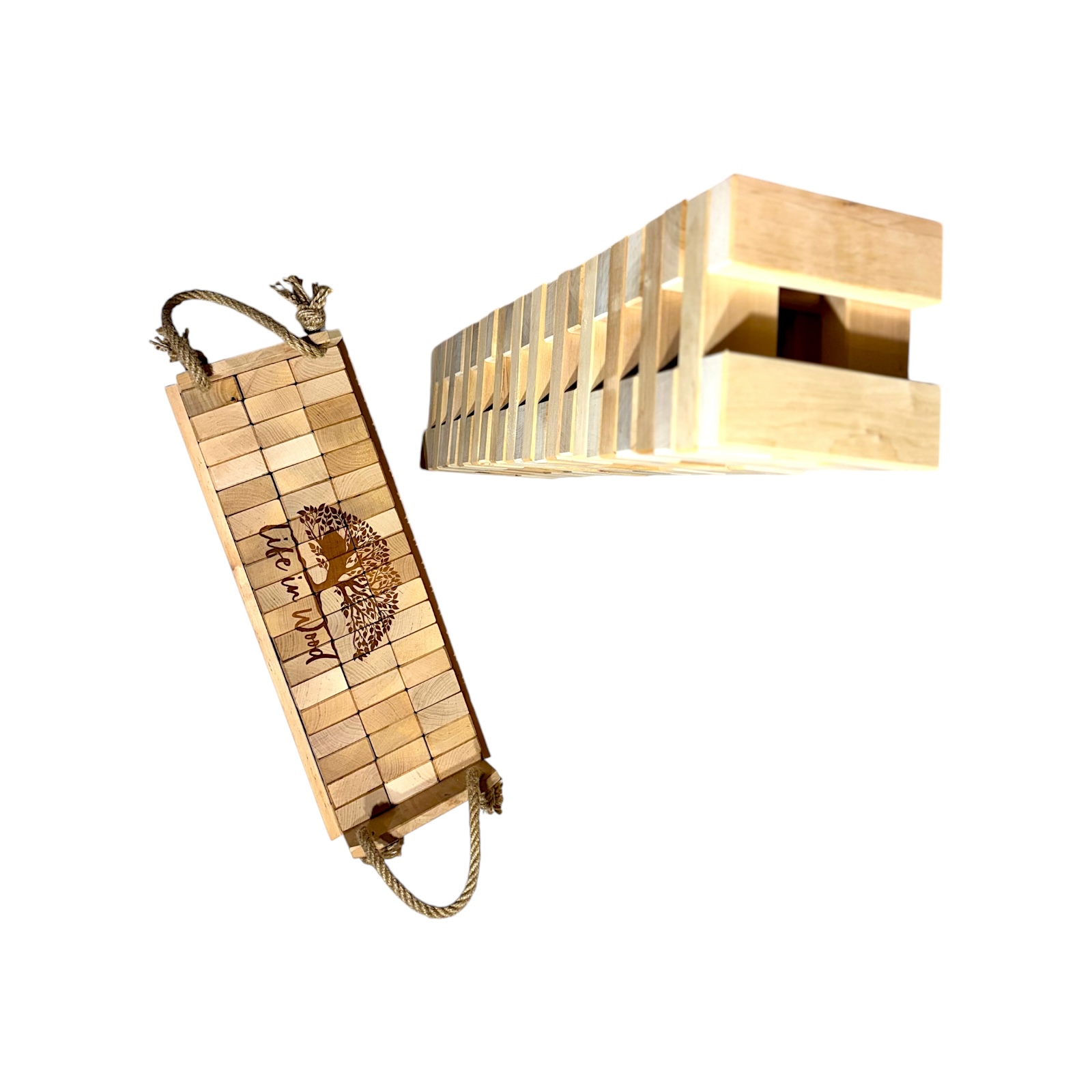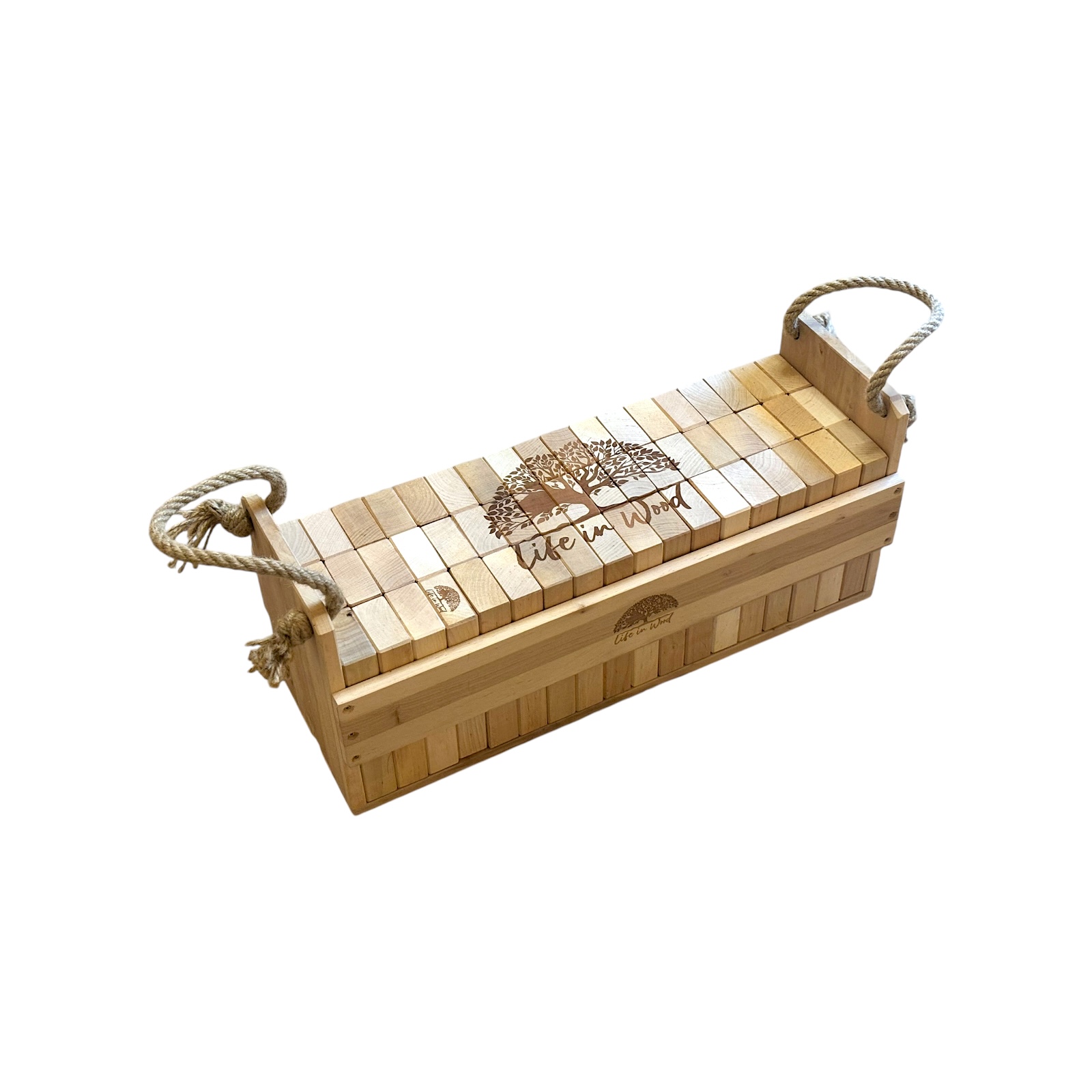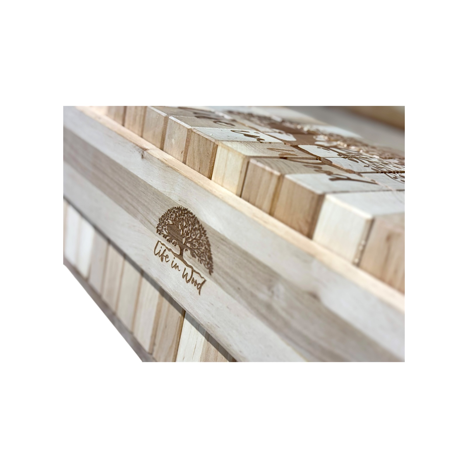 Klocki drewniane XXL z indywidualnym grawerem to połączenie zabawy, elegancji i personalizacji. Zestaw 54 naturalnych klocków z drewna olchowego w solidnej skrzyni ze sznurem jutowym zyskuje unikalny charakter dzięki możliwości naniesienia dowolnego napisu, logo czy grafiki.