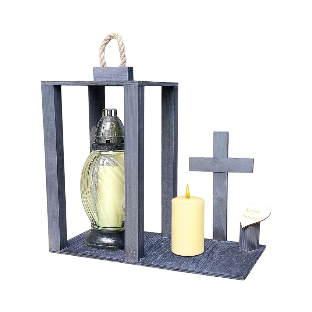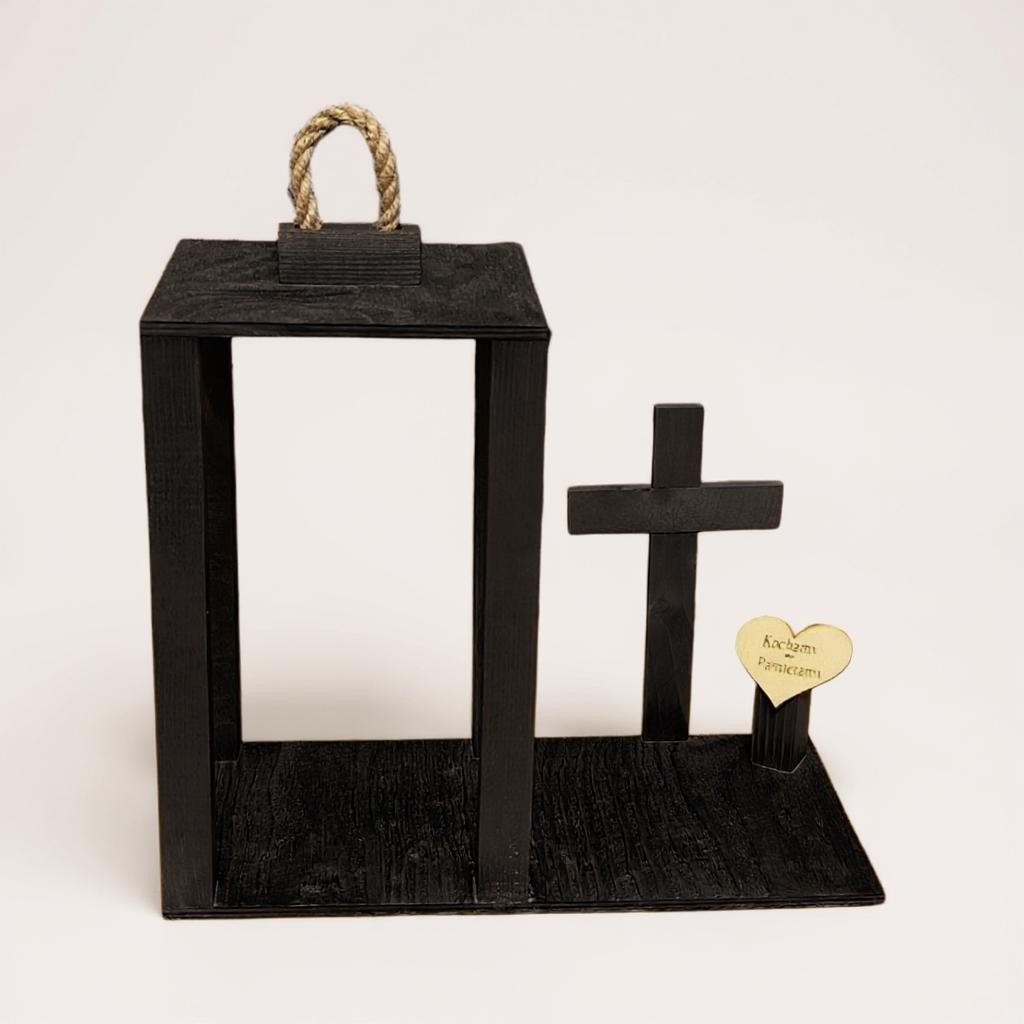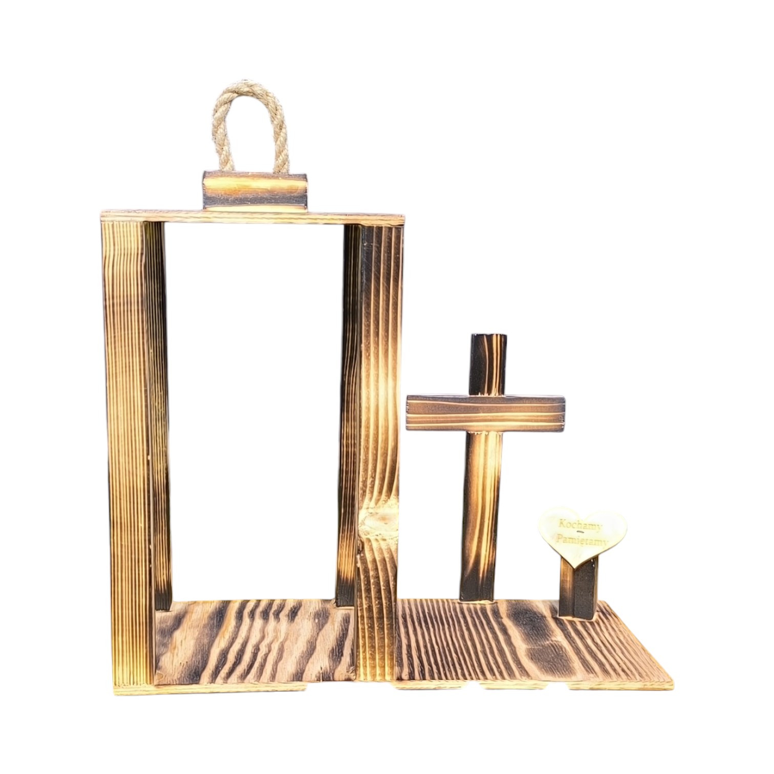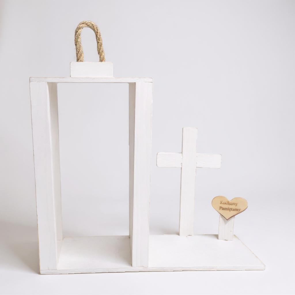 Lampion drewniany z krzyżem i sercem „Kochamy Pamiętamy” – idealny na cmentarz, do kapliczki i na Święto Zmarłych