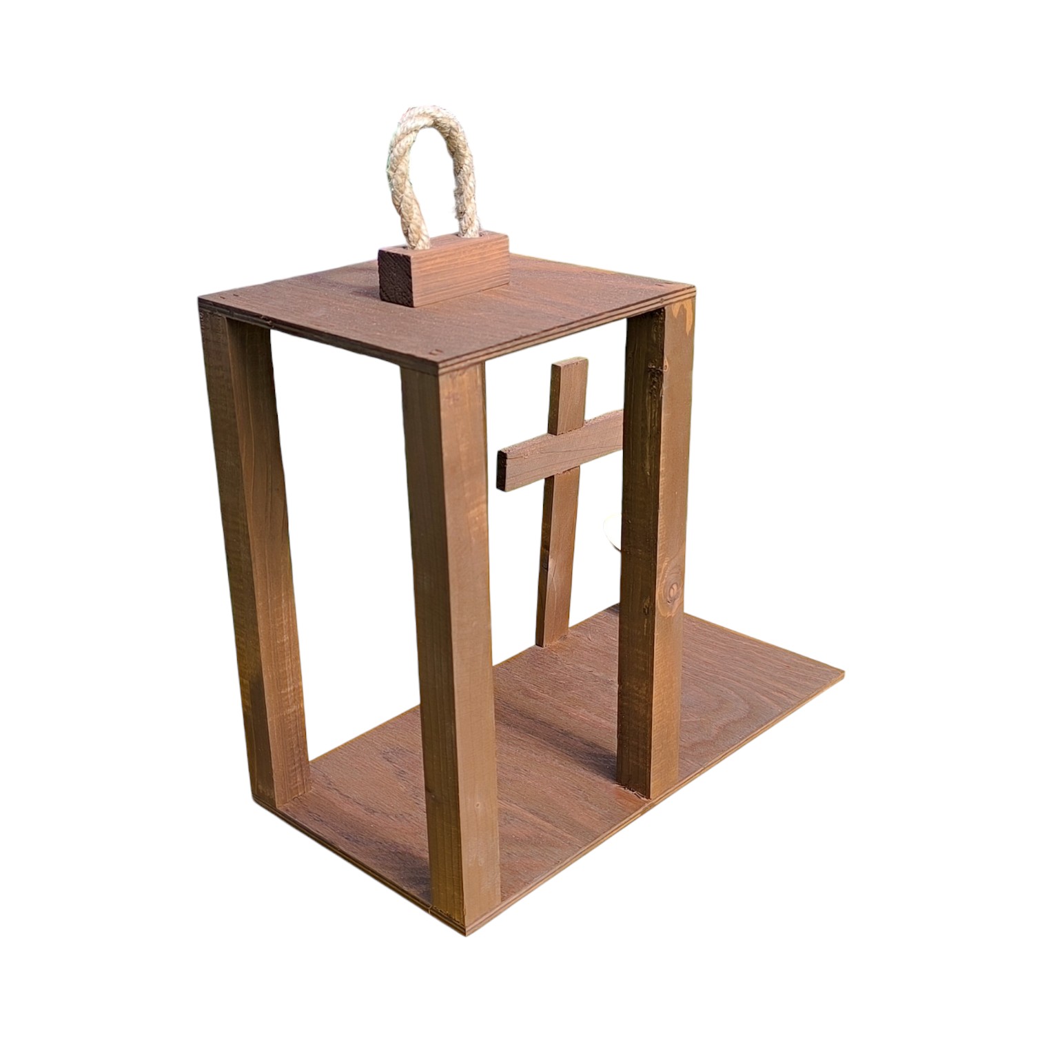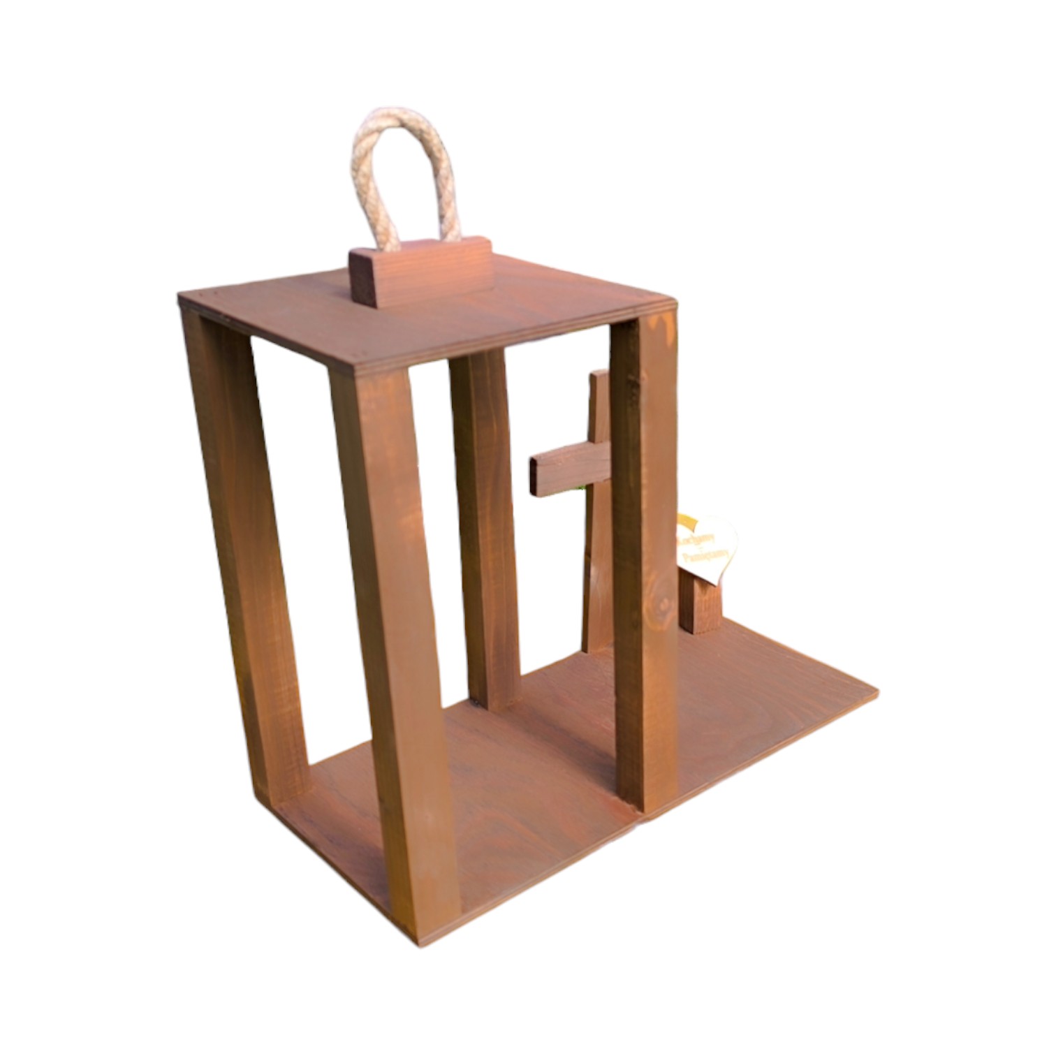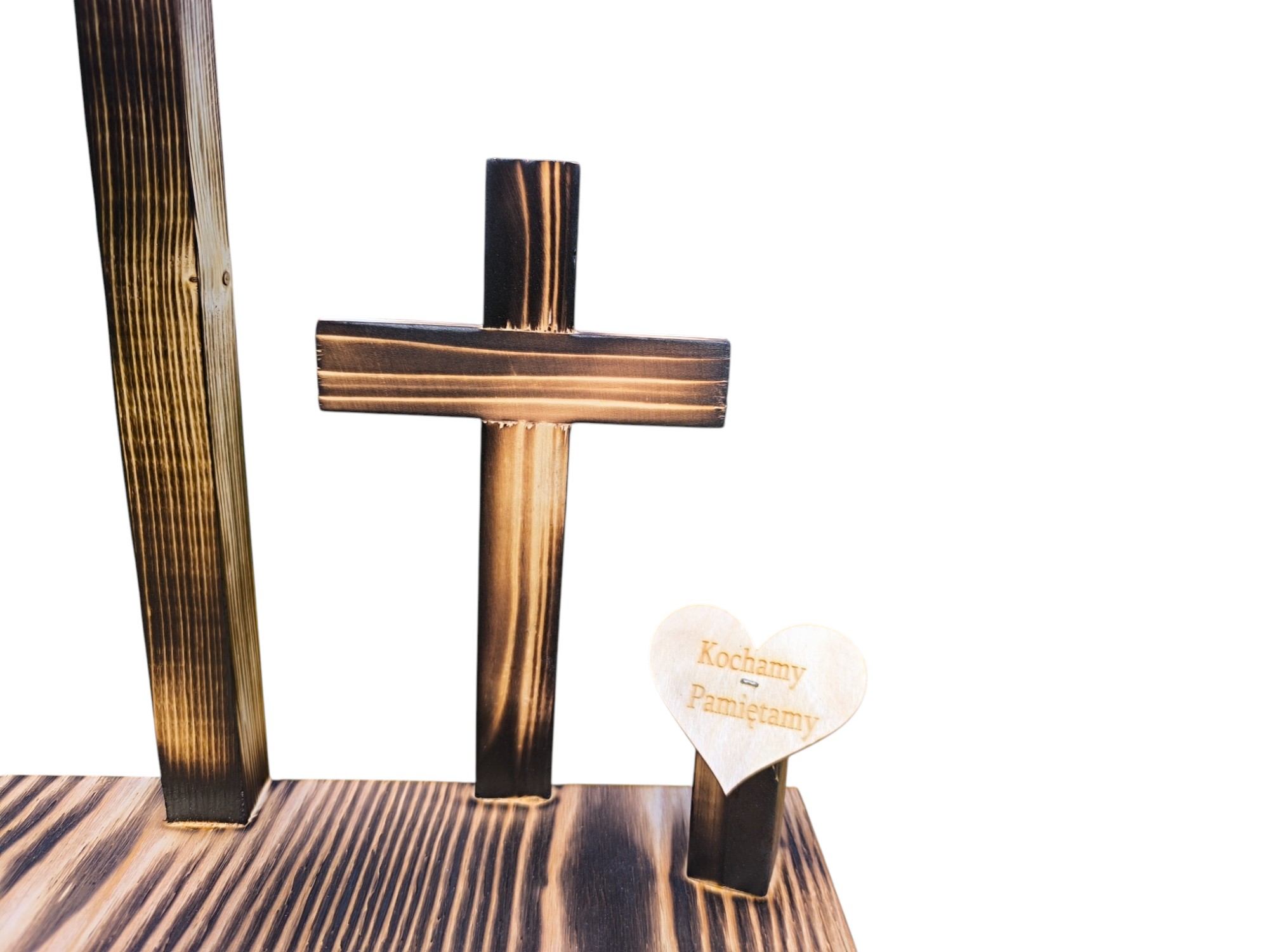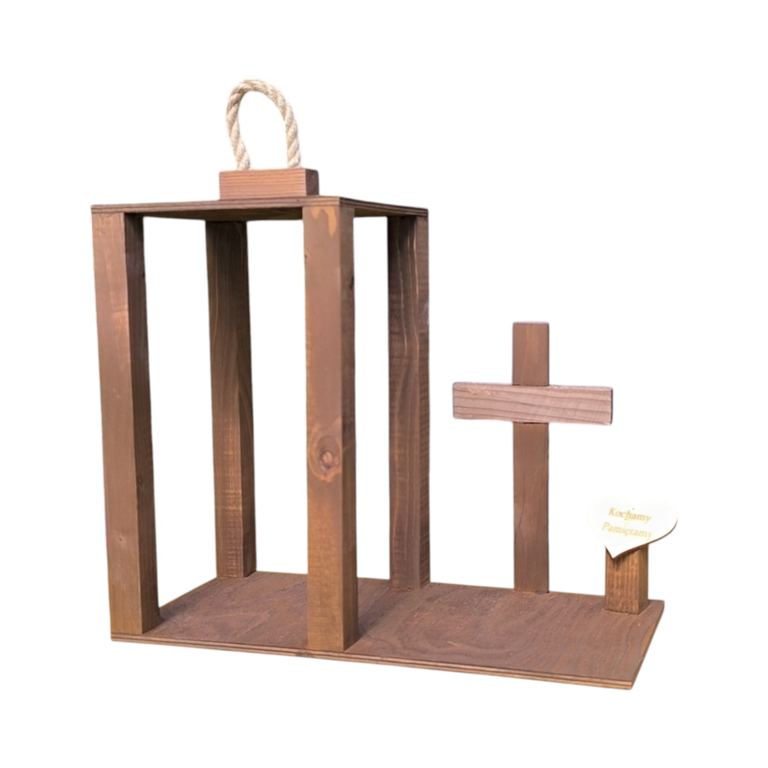 Drewniany lampion nagrobny z krzyżem i sercem z grawerem „Kochamy Pamiętamy” to elegancka i trwała dekoracja na grób lub do kapliczki. Wykonany w całości z drewna, zabezpieczony impregnatem, odporny na warunki atmosferyczne – doskonały do użytku zewnętrznego przez cały rok.