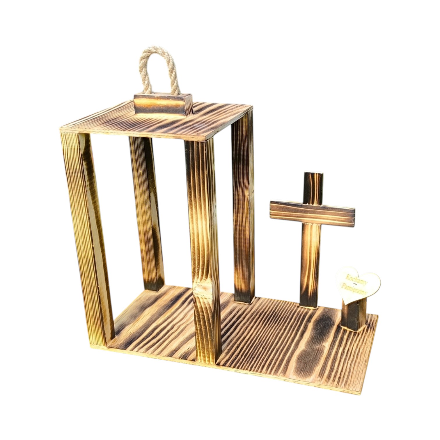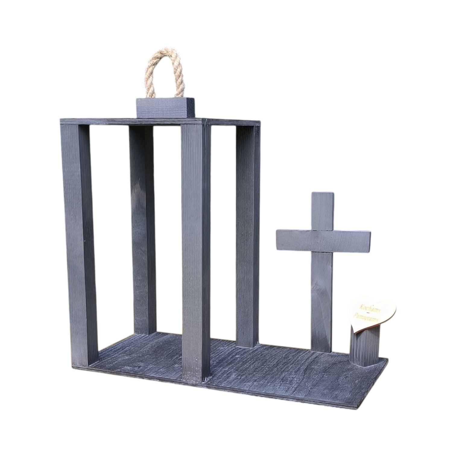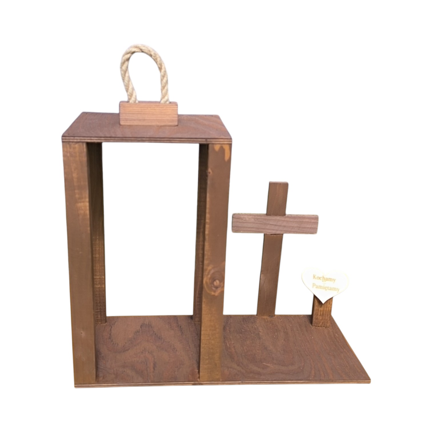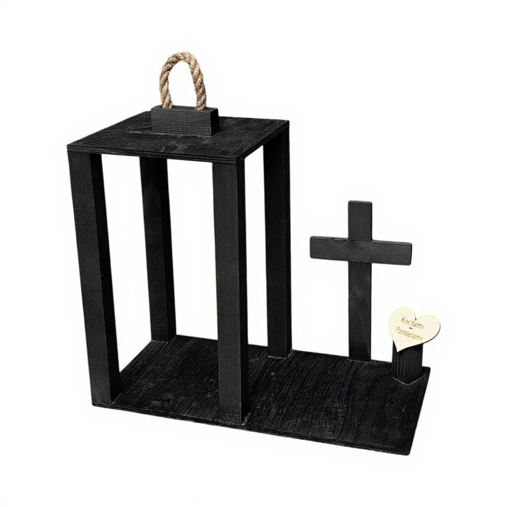 Elegancki, drewniany lampion nagrobny z krzyżem i sercem „Kochamy Pamiętamy”. Idealny do kapliczek i dekoracji grobów na Wszystkich Świętych i Święto Zmarłych. Świetny pomysł na stworzenie stroika lub wiecznej pamiątki bliskich.