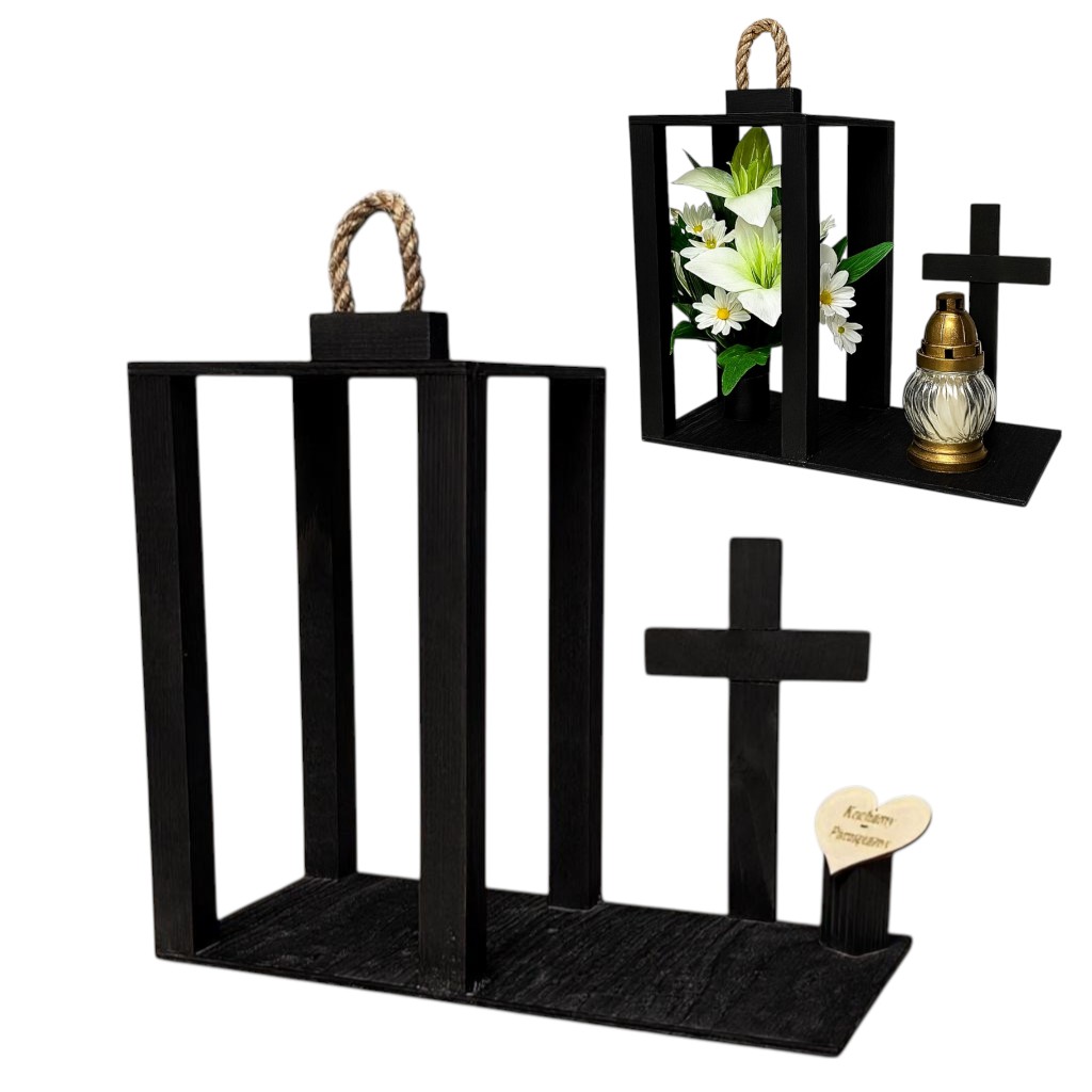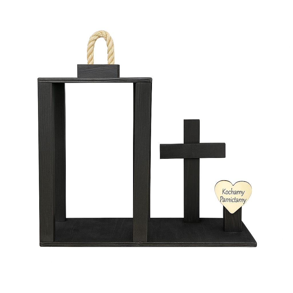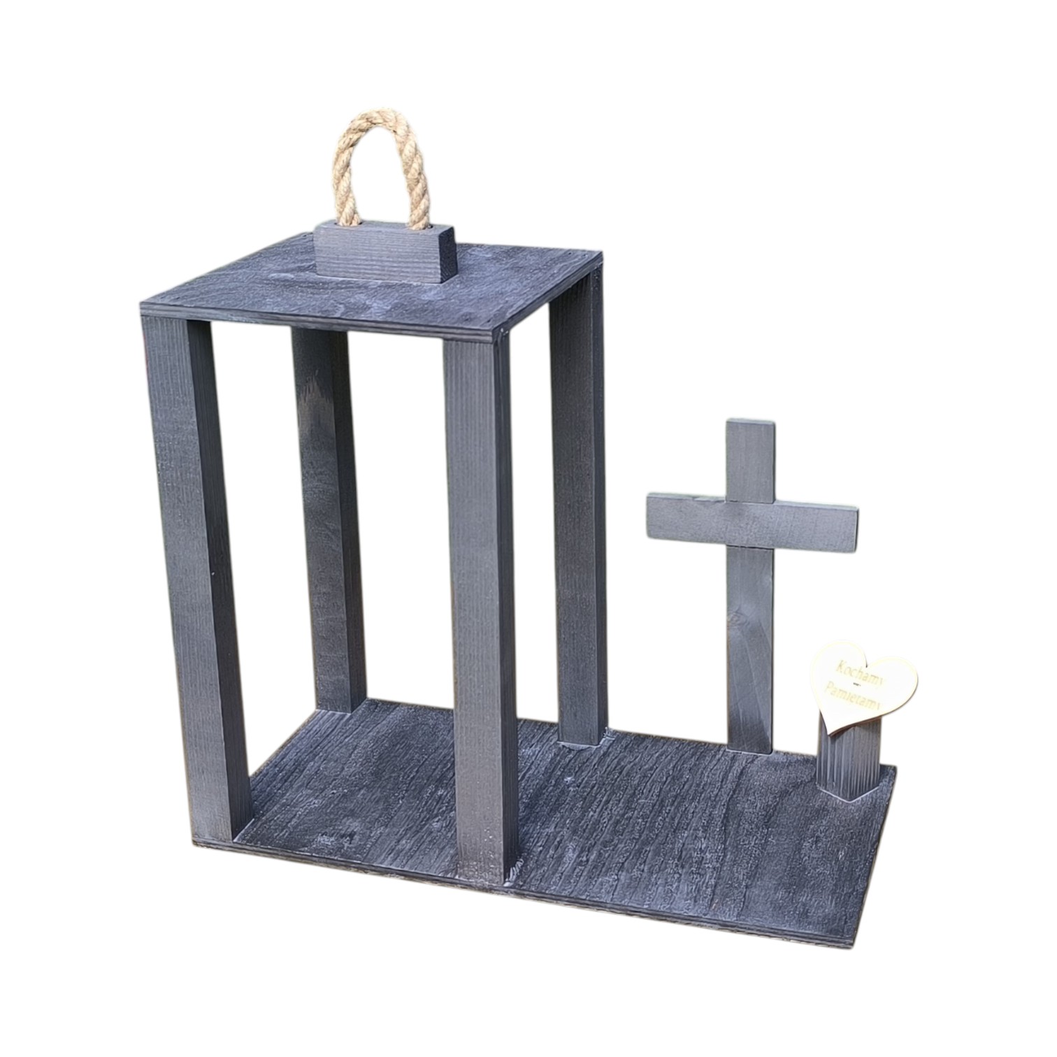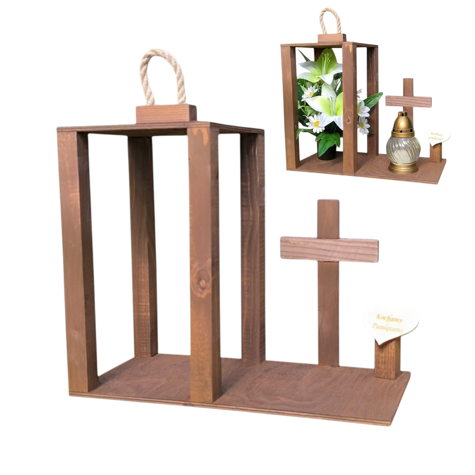 Elegancki, drewniany lampion nagrobny z krzyżem i sercem „Kochamy Pamiętamy”. Idealny do kapliczek i dekoracji grobów na Wszystkich Świętych i Święto Zmarłych. Świetny pomysł na stworzenie stroika lub wiecznej pamiątki bliskich.