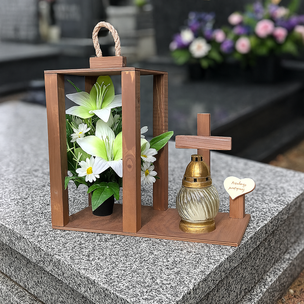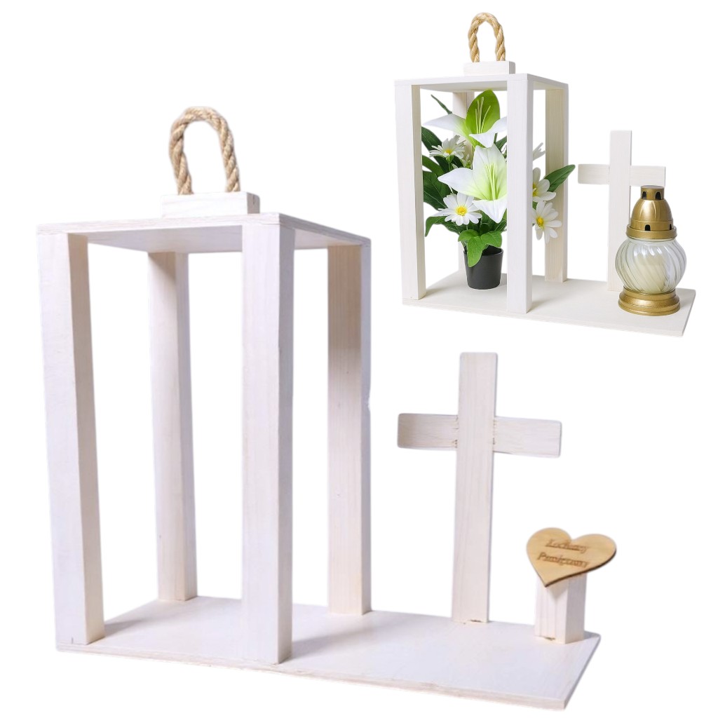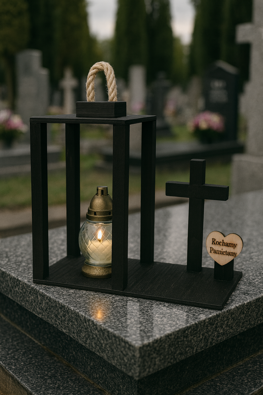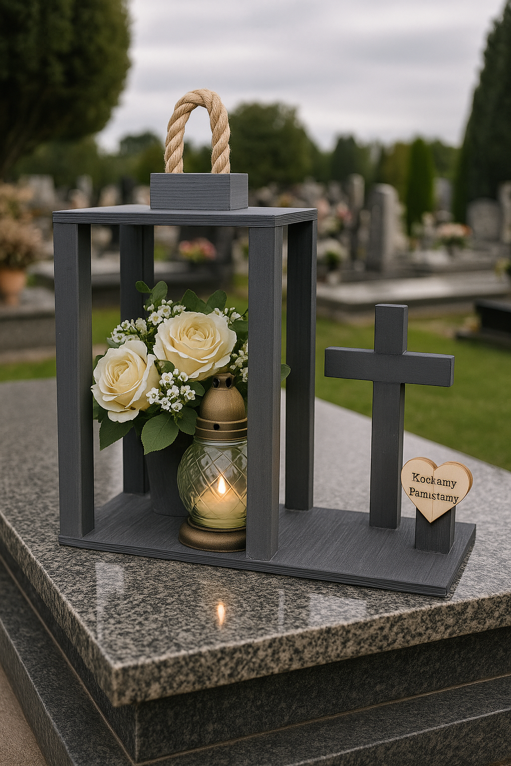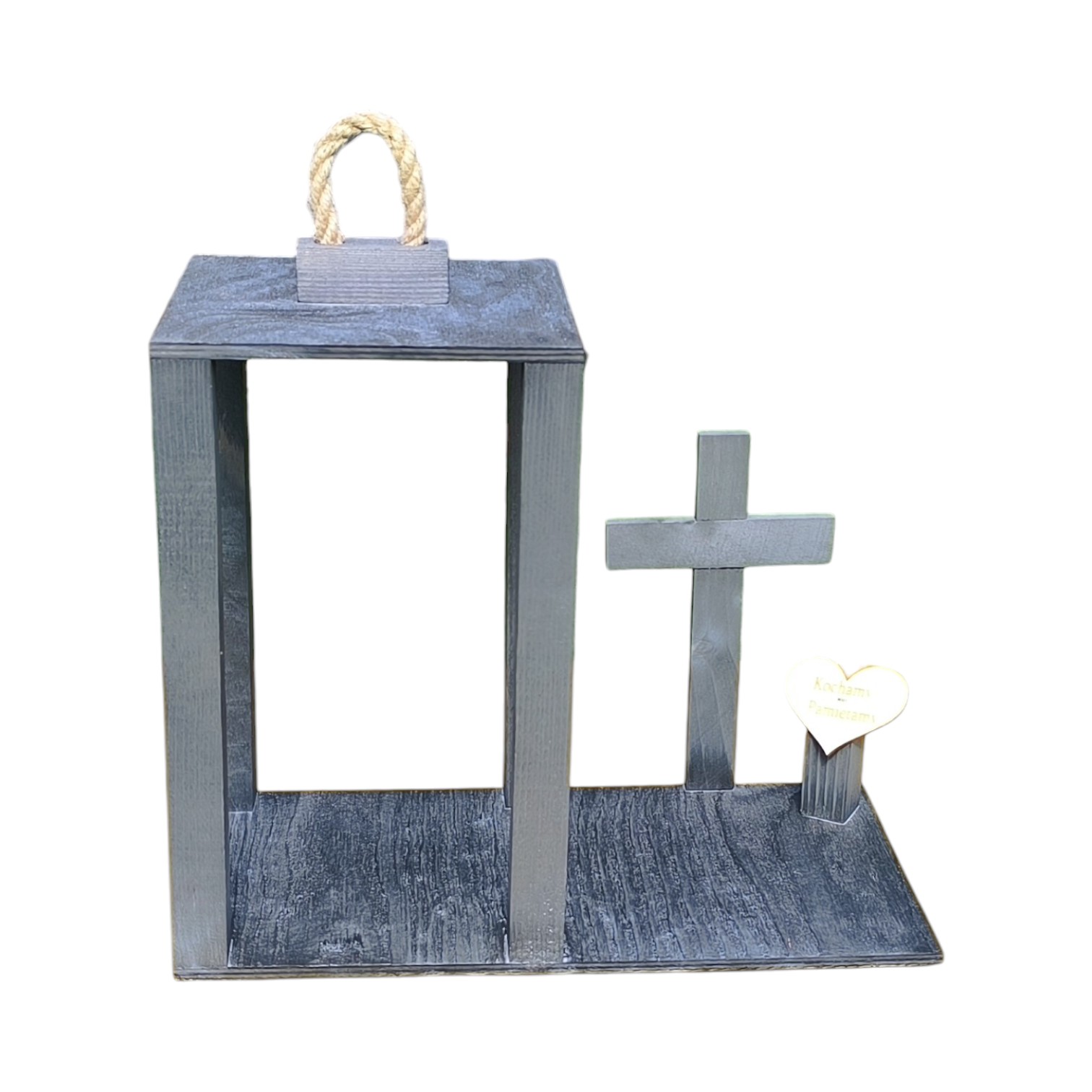 Elegancki, drewniany lampion nagrobny z krzyżem i sercem „Kochamy Pamiętamy”. Idealny do kapliczek i dekoracji grobów na Wszystkich Świętych i Święto Zmarłych. Świetny pomysł na stworzenie stroika lub wiecznej pamiątki bliskich.