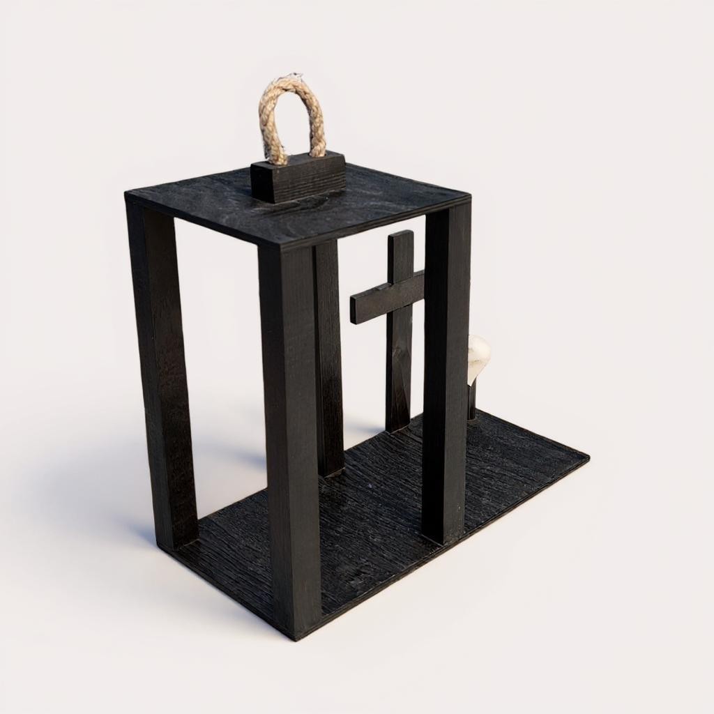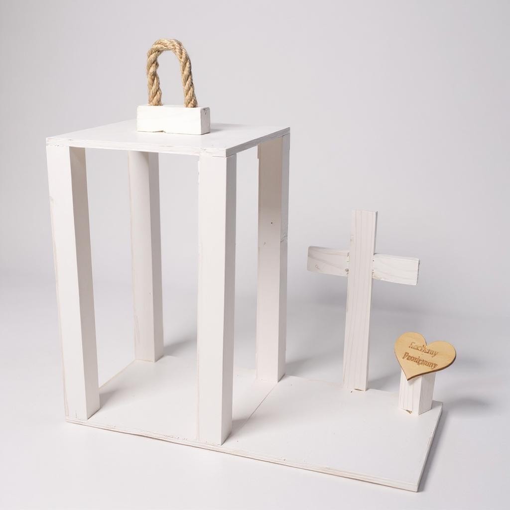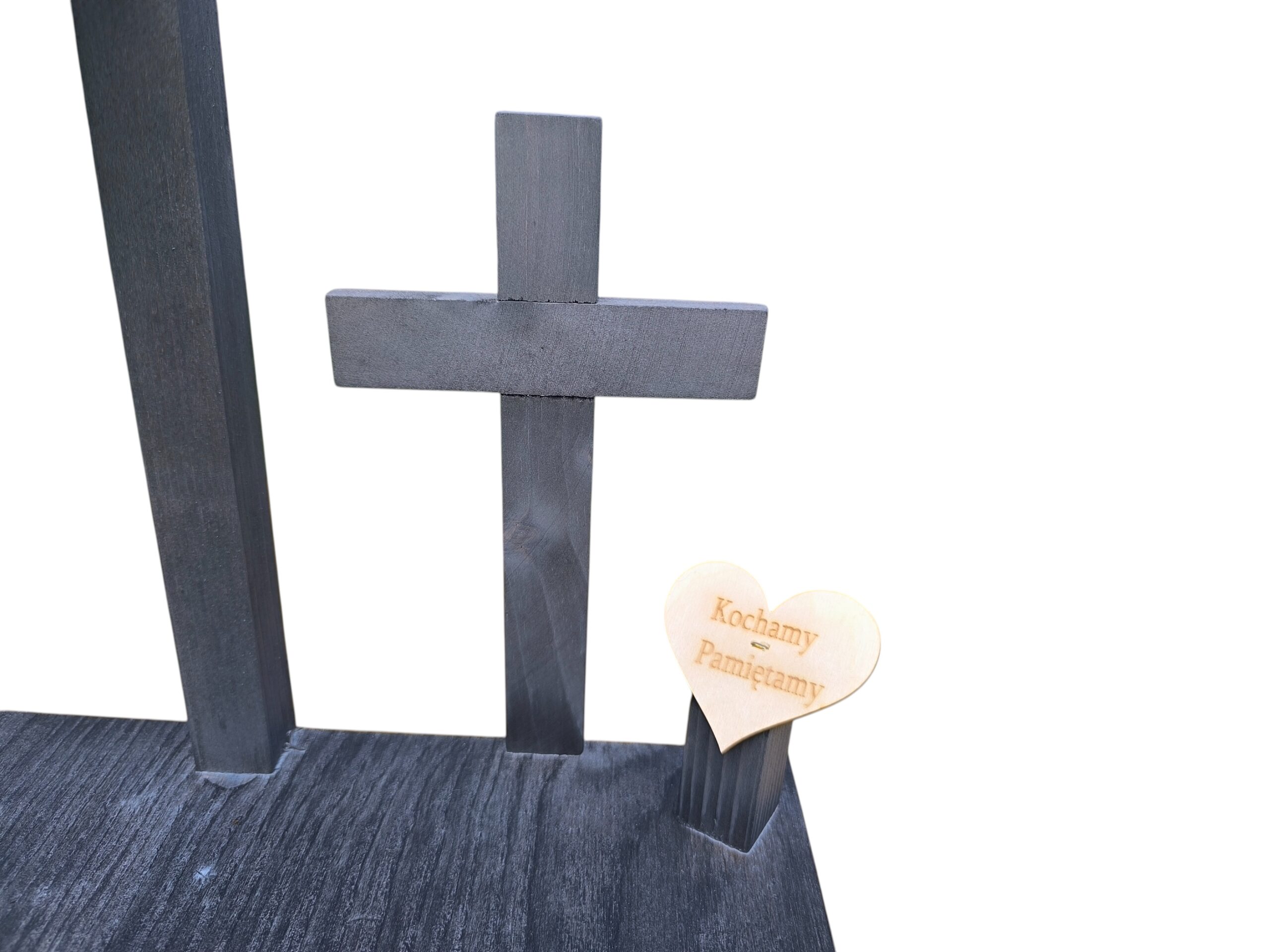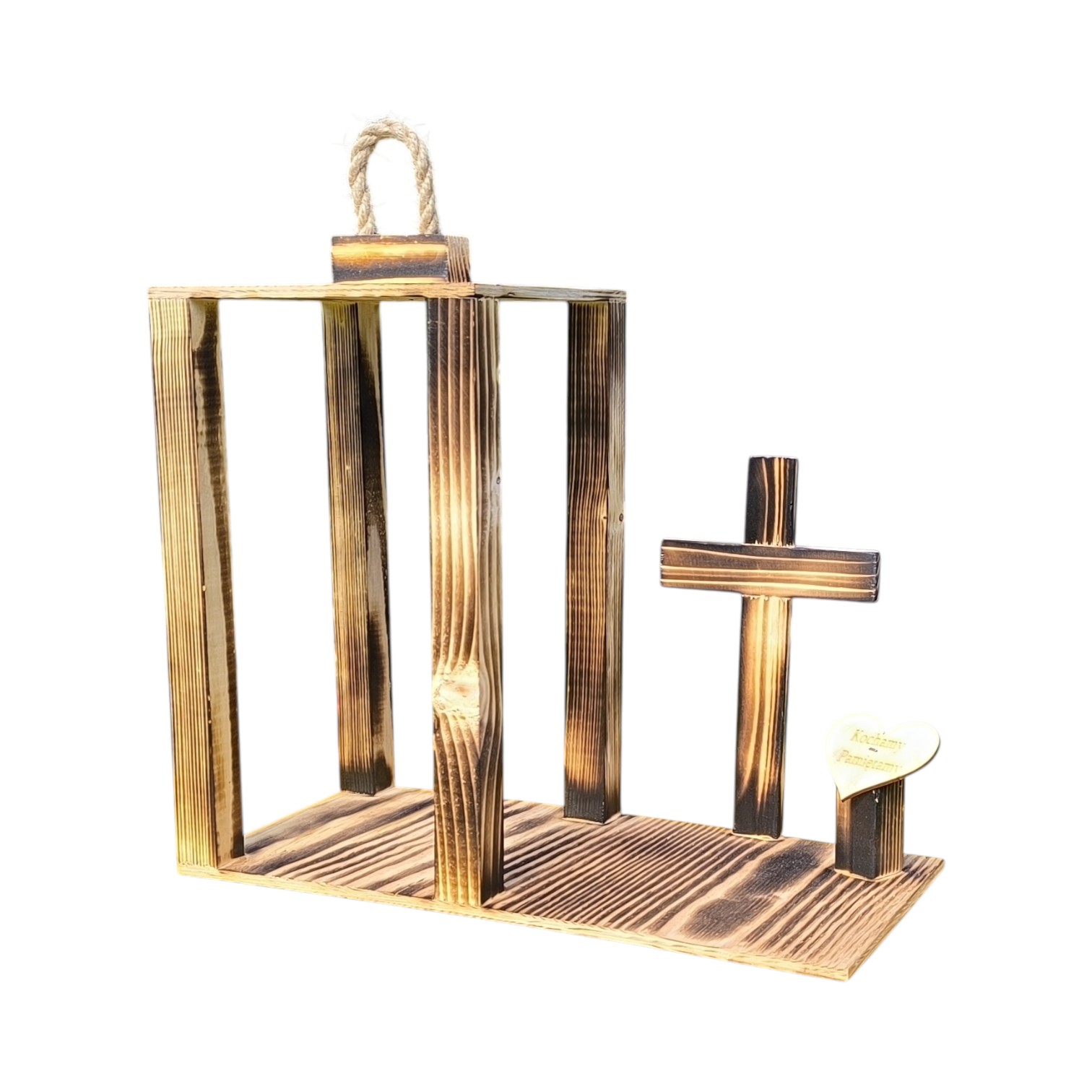 Elegancki, drewniany lampion nagrobny z krzyżem i sercem „Kochamy Pamiętamy”. Idealny do kapliczek i dekoracji grobów na Wszystkich Świętych i Święto Zmarłych. Świetny pomysł na stworzenie stroika lub wiecznej pamiątki bliskich.