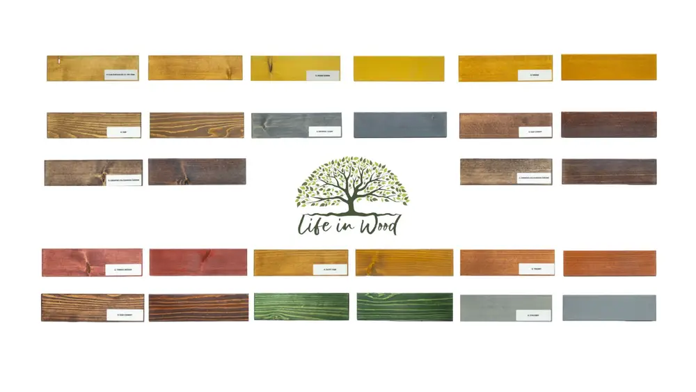 Bezbarwny, Zielony, Dąb, Dąb ciemny, Dąb portugalski, Dąb złoty, Palisander, Szary, Palisander średni, Sosna, Sosna jasna, Stalowy, Tik, Wiśnia, Biały Anglia, Biała Anglia 50% pigmentacji