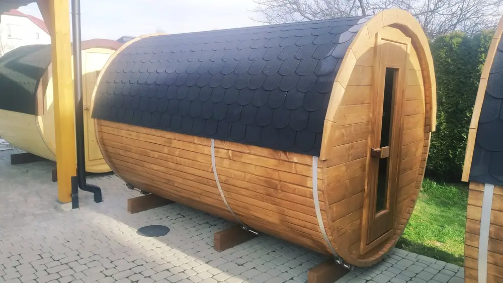 Sauna ogrodowa 270 cm z przedsionkiem typu beczka pokryta gontem bitumicznym
