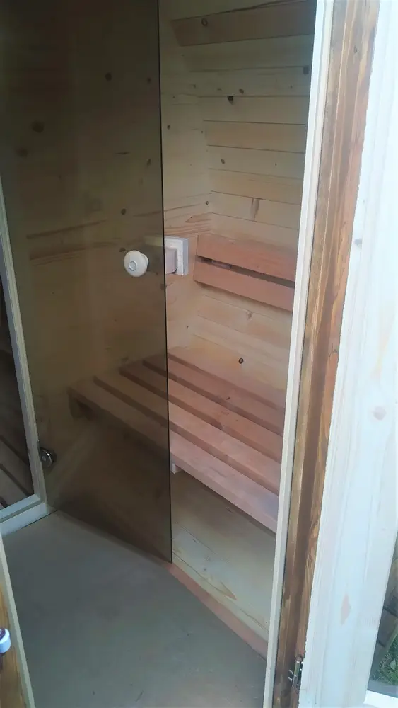 Drzwi są drewniane z przeszkleniem ze szkła hartowanego, przyciemnionego, co daje komfort spędzania czasu podczas seansu a dodatkowo zapewniają lepsze wartości termiczne.