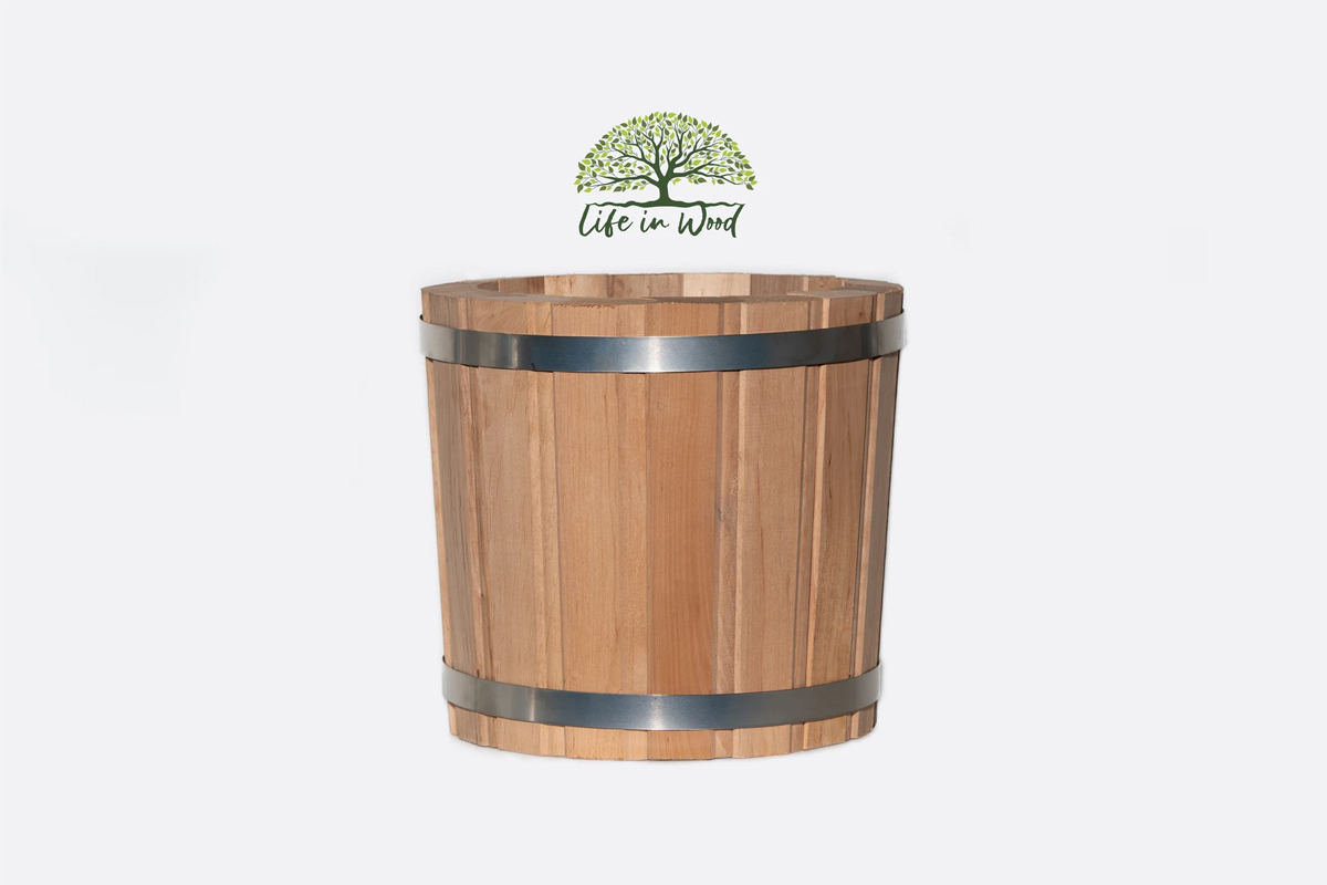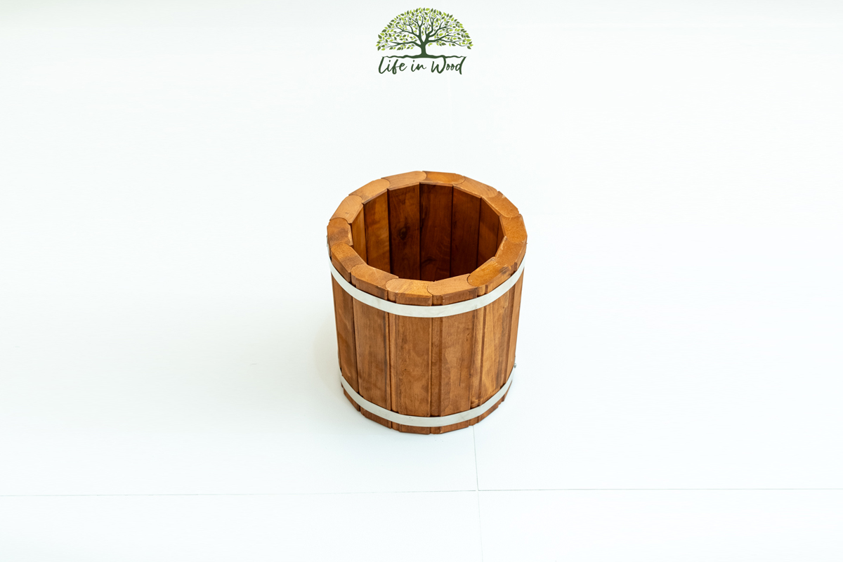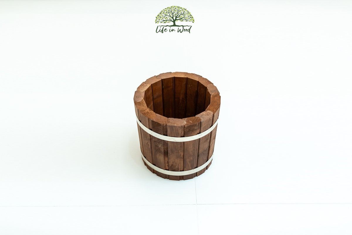 Wiaderko zostało wykonane z drewna olchowego, które zapewnia naturalny wygląd i trwałość. Wiaderko ręcznie zabezpieczyliśmy wybranym impregnatem, który jest dostępny w wielu kolorach, co pozwala dopasować je do swojego wnętrza lub ogrodu. Wiaderko wyróżnia się solidnym dopasowaniem klepek, zapewniając trwałość i odporność na różne warunki pogodowe. Dzięki temu będzie służyć przez wiele sezonów, utrzymując swój pierwotny wygląd. Opaski wiaderka, połączone nitami, zostały wykonane ze stali nierdzewnej. Daje to możliwość doszczelnienia wiaderka w przypadku używania go jako narzędzia do noszenia wody.
