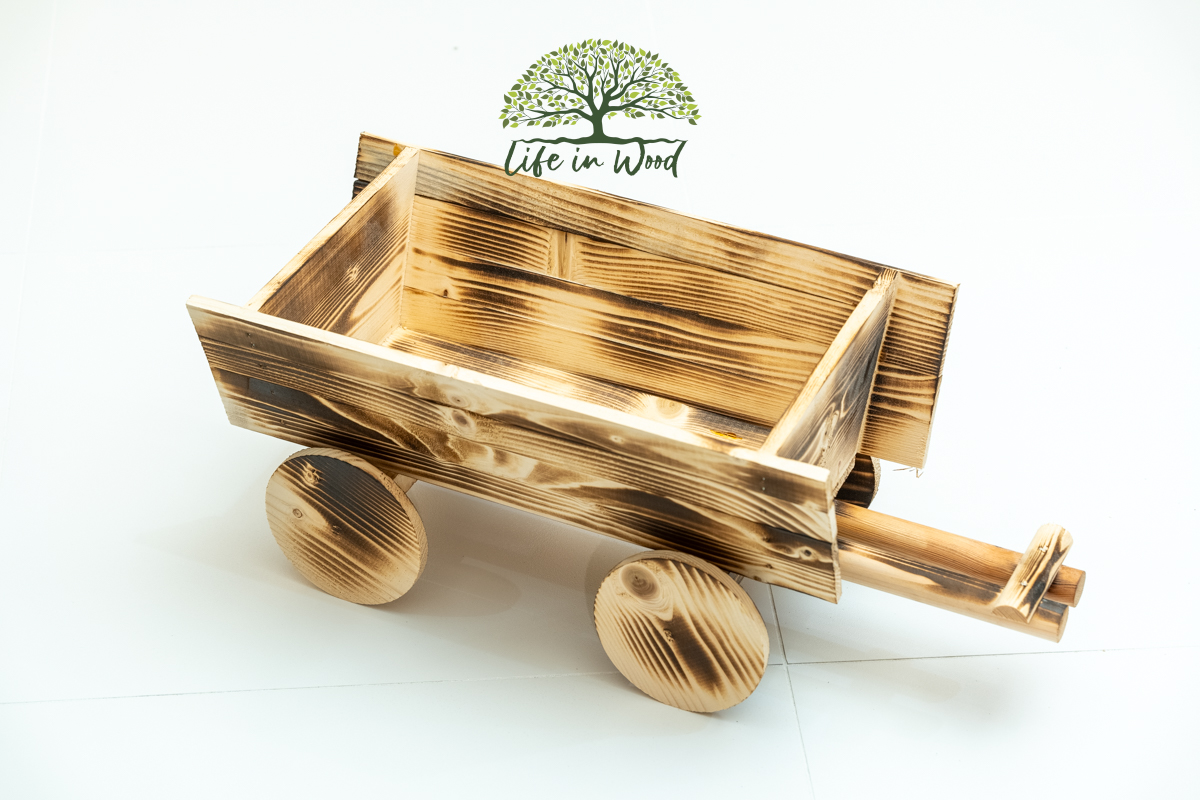 - Efektowne Wykończenie: Drewno wózka zostało starannie opalone, nadając mu unikalny, rustykalny charakter. To stylowe akcenty, które zwracają uwagę i dodają uroku Twojej przestrzeni.