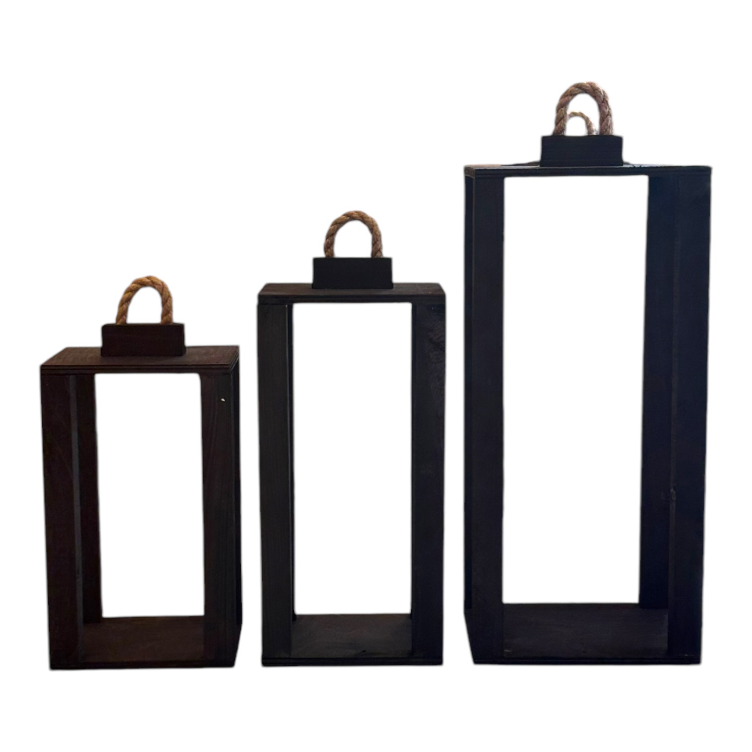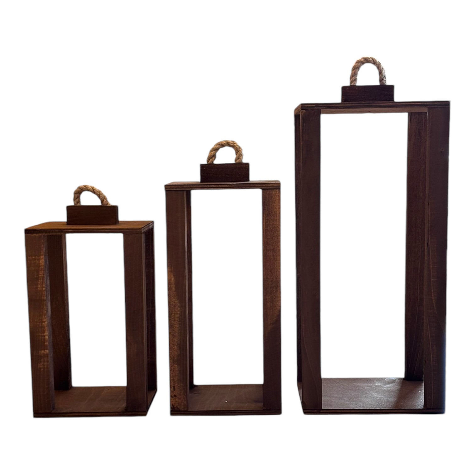 Zestaw trzech drewnianych lampionów o wymiarach 35 cm, 40 cm i 50 cm
