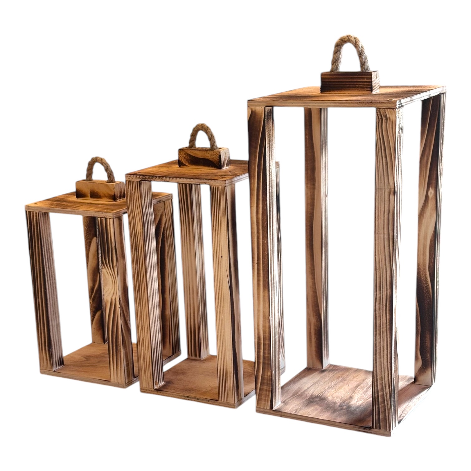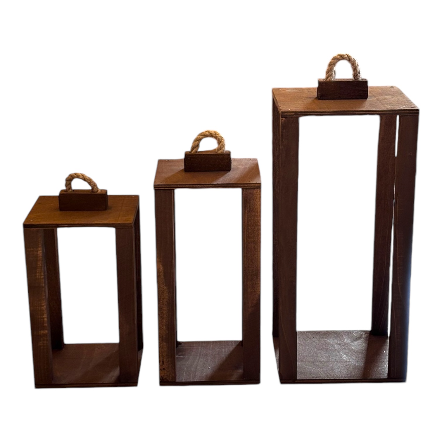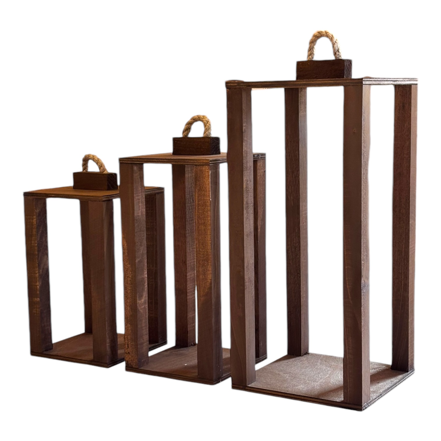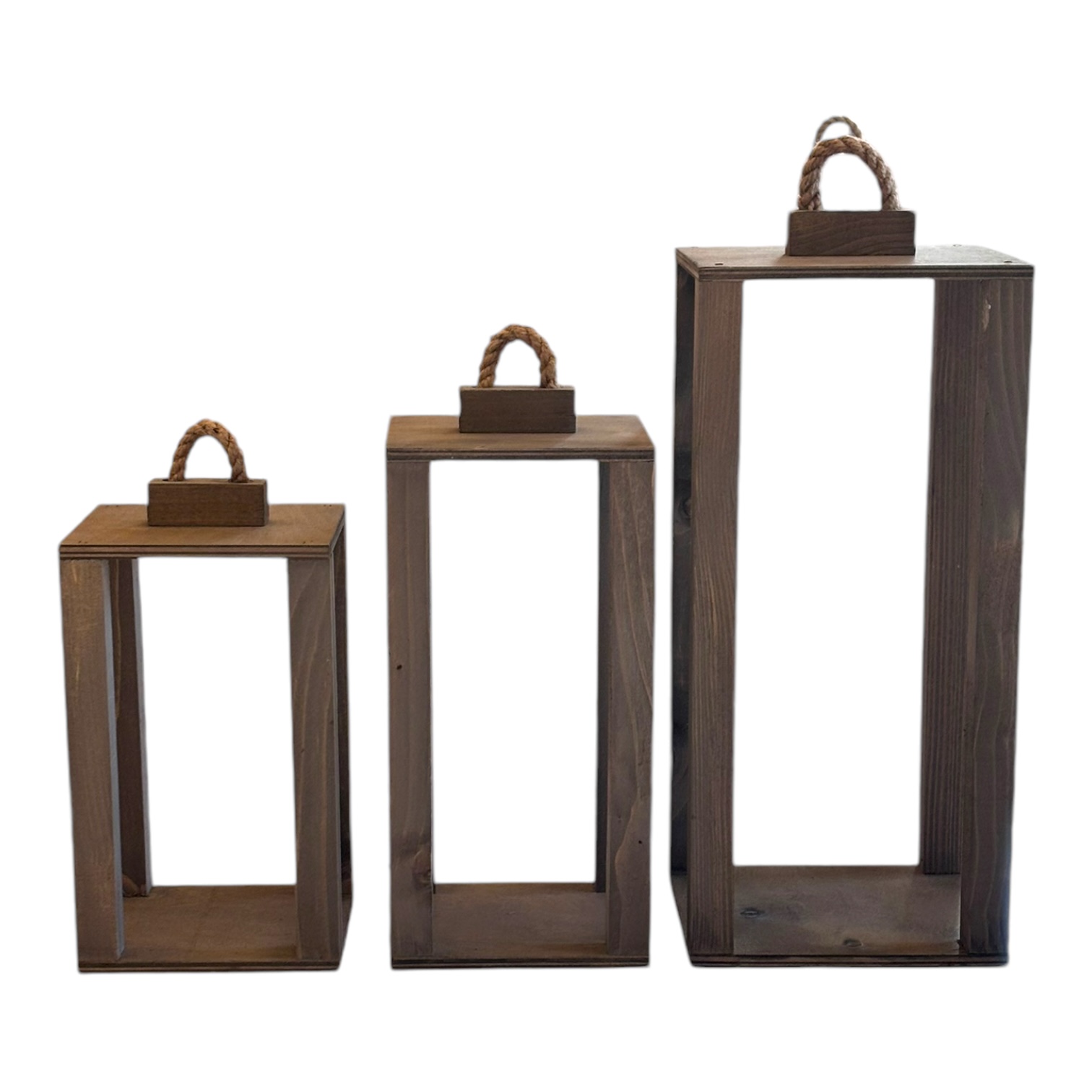 Zestaw trzech drewnianych lampionów o wymiarach 35 cm, 40 cm i 50 cm
