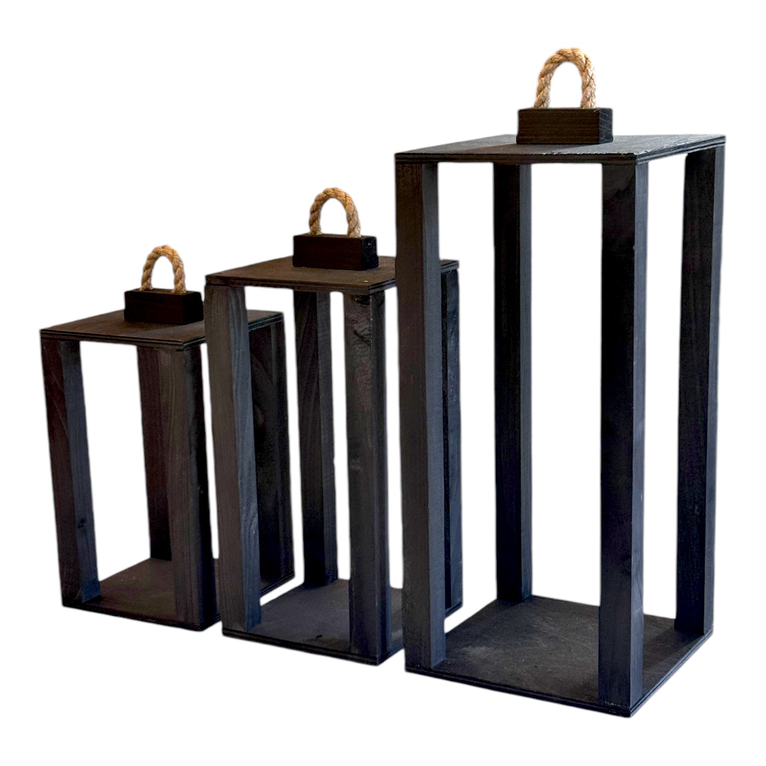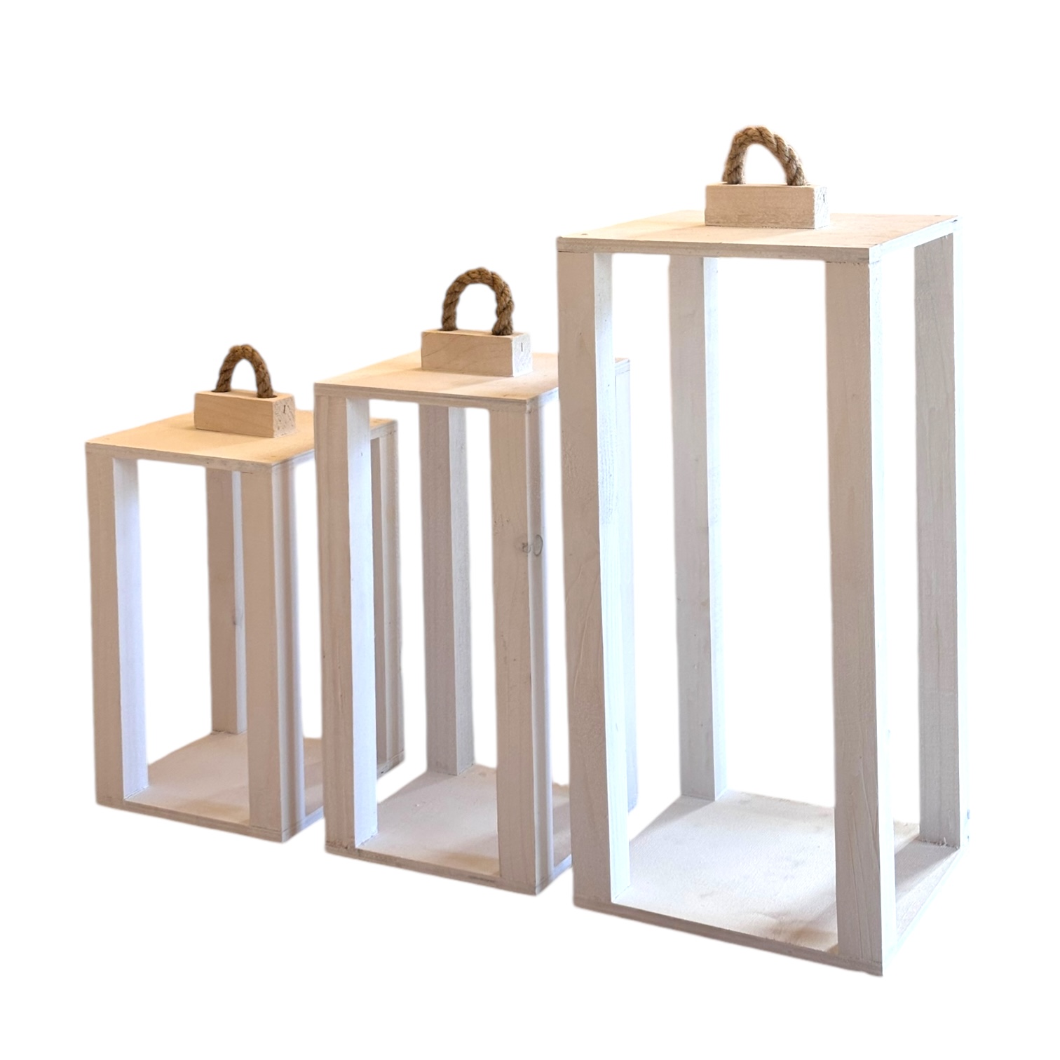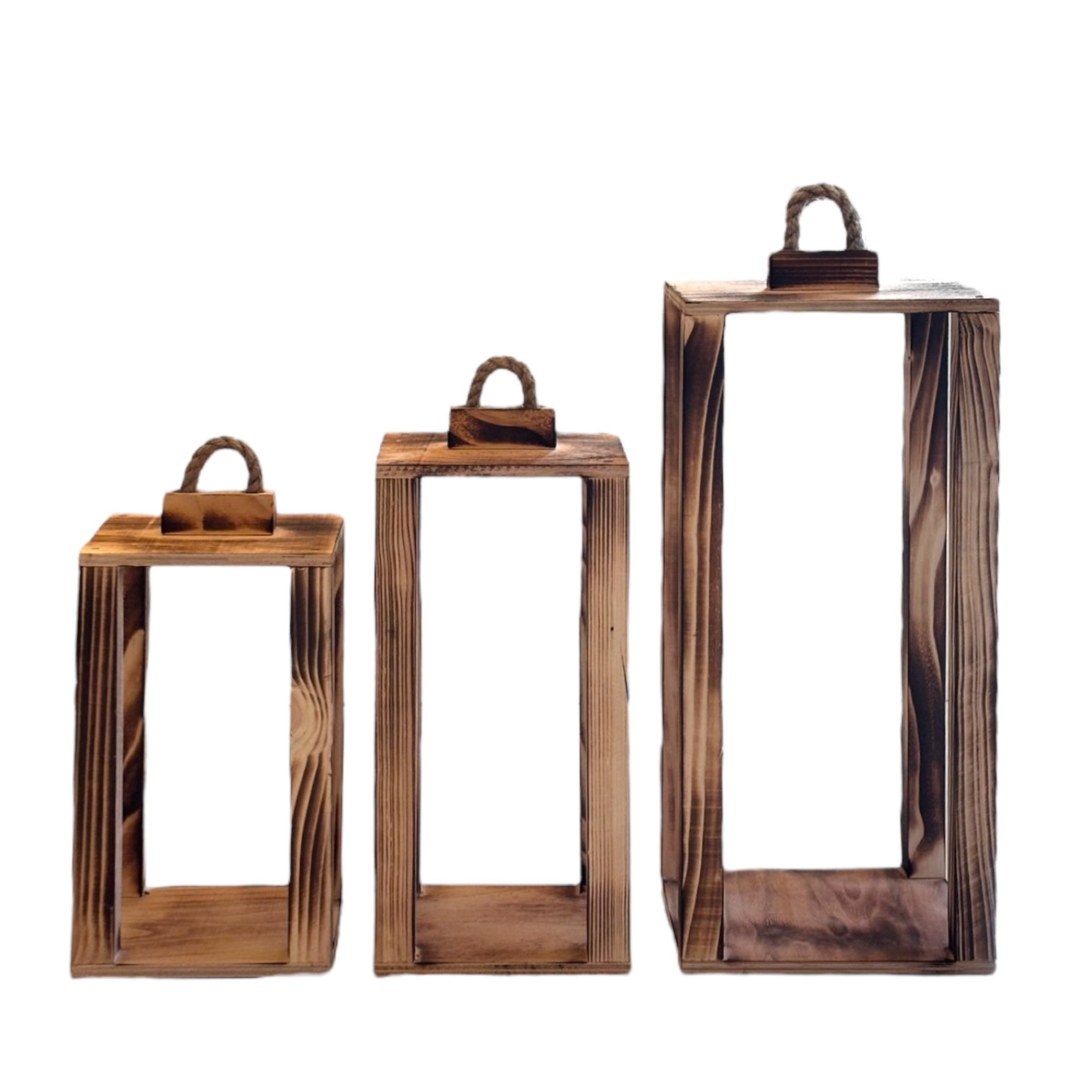Zestaw trzech drewnianych lampionów o wymiarach 35 cm, 40 cm i 50 cm