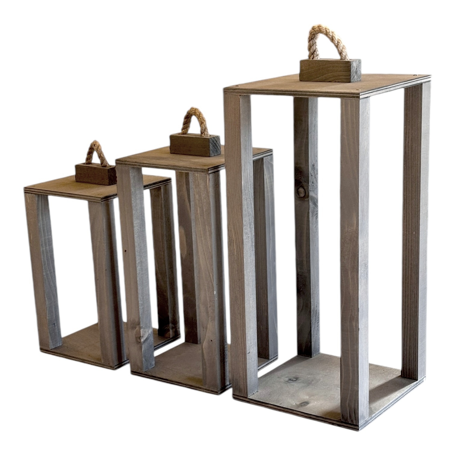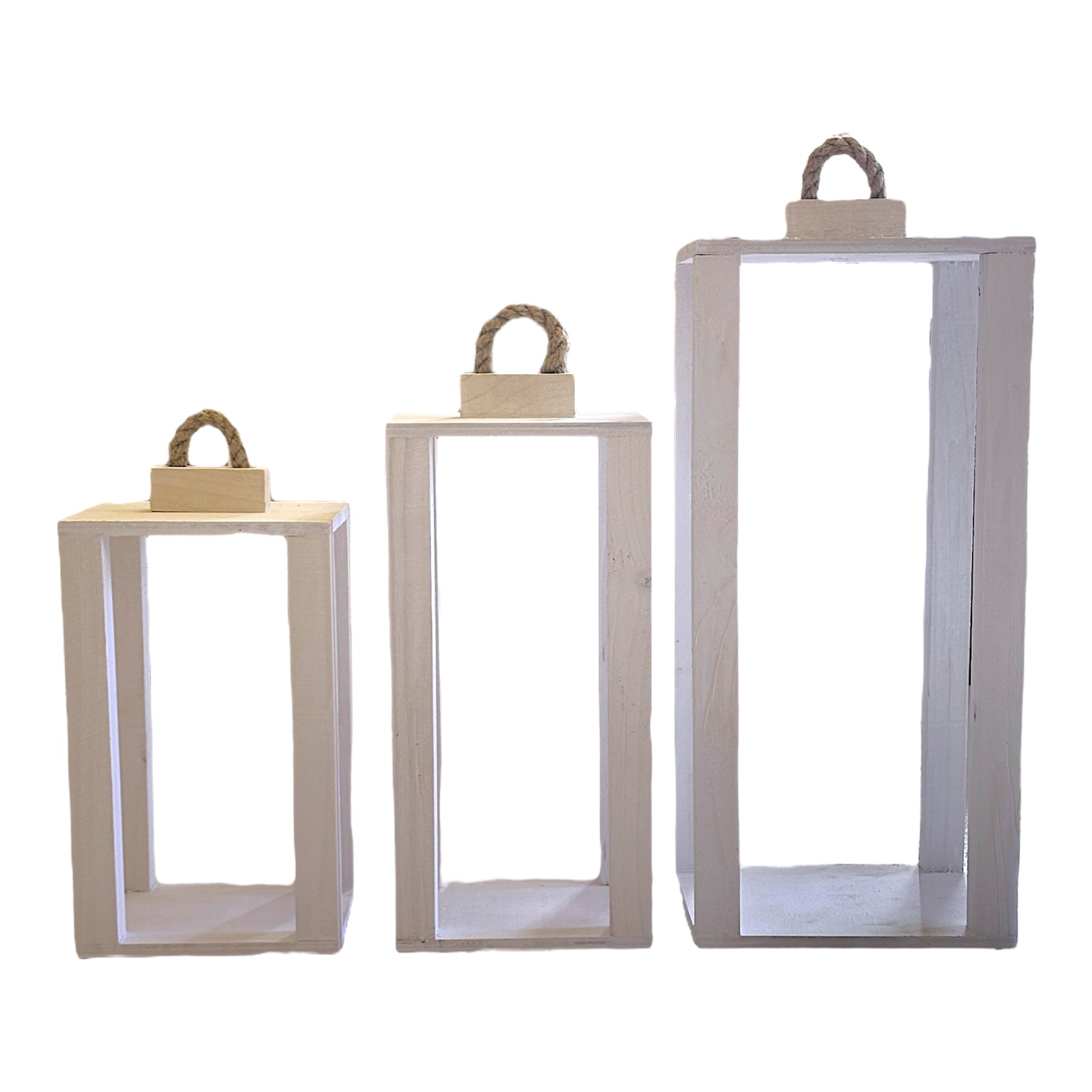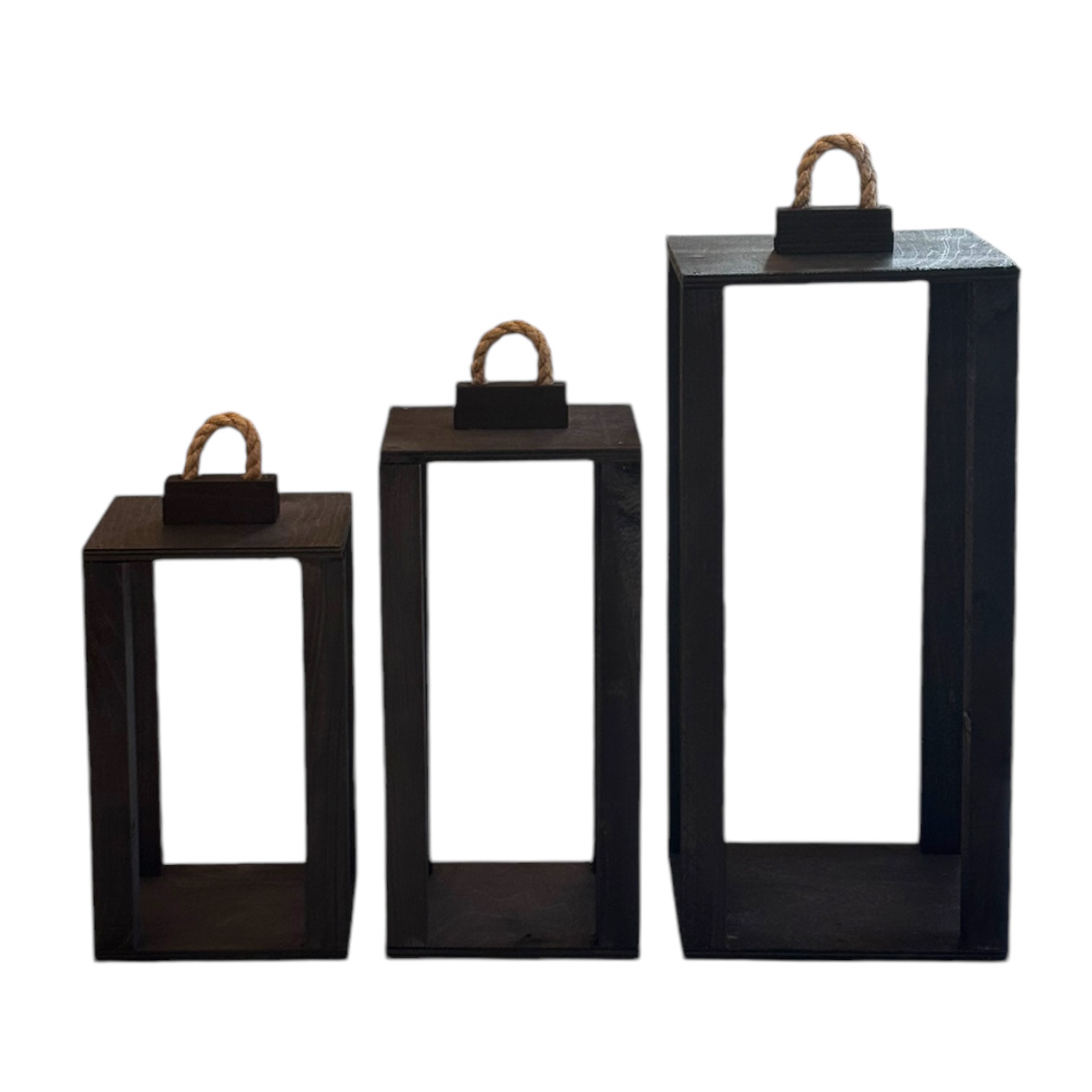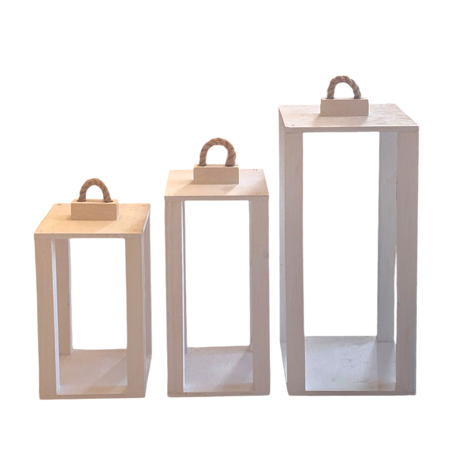 Zestaw trzech drewnianych lampionów o wymiarach 35 cm, 40 cm i 50 cm
