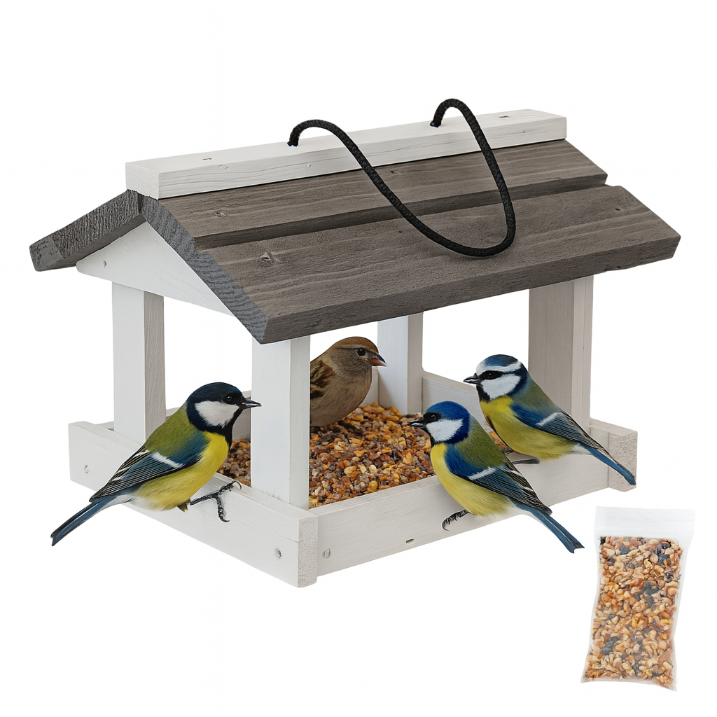 Drewniany karmnik dla ptaków biało-szary – nowoczesny design + karma 100 g GRATIS