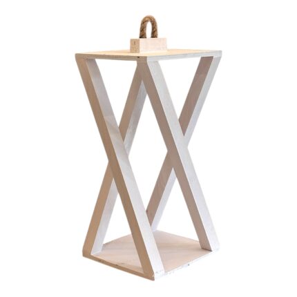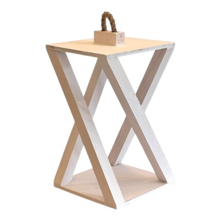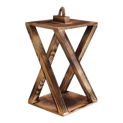 Stylowy, ręcznie wykonany lampion z naturalnego drewna sosnowego, idealny do dekoracji wnętrz oraz ogrodów. Wykonany z najwyższej jakości materiałów, w tym solidnego drewna oraz sklejki, co gwarantuje trwałość i odporność na warunki atmosferyczne.