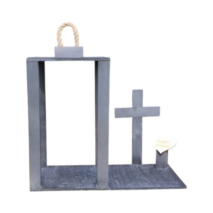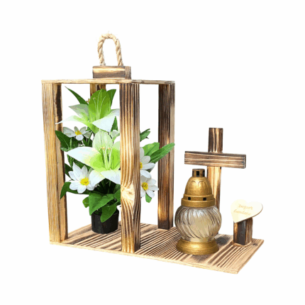 Elegancki, drewniany lampion nagrobny z krzyżem i sercem „Kochamy Pamiętamy”. Idealny do kapliczek i dekoracji grobów na Wszystkich Świętych i Święto Zmarłych. Świetny pomysł na stworzenie stroika lub wiecznej pamiątki bliskich.